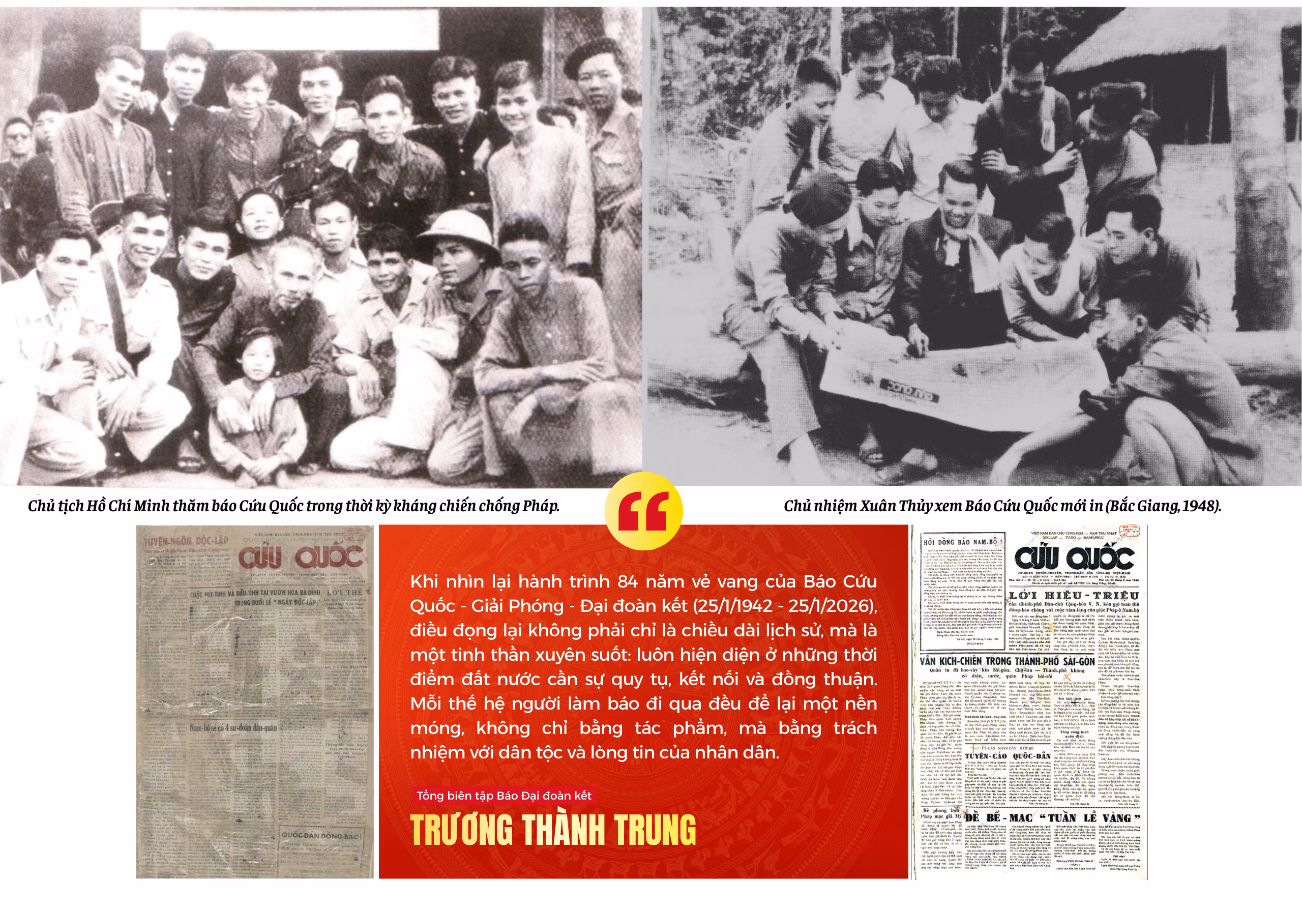 - Khi nhìn lại hành trình 84 năm vẻ vang của Báo Cứu Quốc - Giải Phóng - Đại đoàn kết (25/1/1942 - 25/1/2026), điều đọng lại không phải chỉ là chiều dài lịch sử, mà là một tinh thần xuyên suốt: luôn hiện diện ở những thời điểm đất nước cần sự quy tụ, kết nối và đồng thuận. Mỗi thế hệ người làm báo đi qua đều để lại một nền móng, không chỉ bằng tác phẩm, mà bằng trách nhiệm với dân tộc và lòng tin của nhân dân.