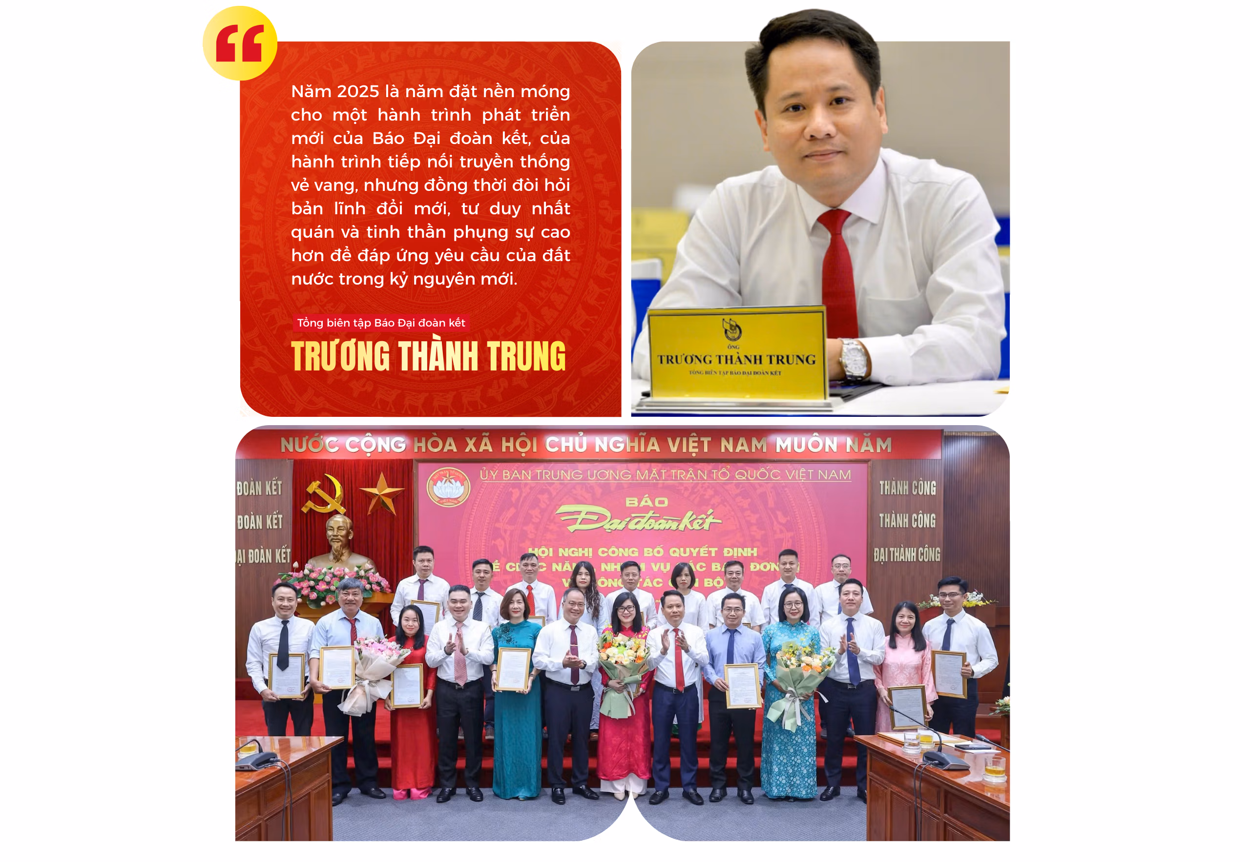 - Với Báo Đại đoàn kết, 2025 là năm xác lập lại con đường phát triển và sứ mệnh của một tờ báo Mặt trận trong bối cảnh đất nước bước vào giai đoạn mới. Quyết định “sắp xếp lại giang sơn” - sắp xếp, tinh gọn bộ máy của hệ thống chính trị trong năm qua là bước đi lịch sử có ý nghĩa chiến lược, đánh dấu một giai đoạn phát triển mới của sự nghiệp hoàn thiện bộ máy hành chính nhà nước, hoàn thiện thể chế và tổ chức của hệ thống chính trị đồng bộ, tinh gọn, hiệu lực, hiệu quả, hướng tới hoàn thiện một nền hành chính quản trị hiện đại, kiến tạo, gần dân, sát dân, vì nhân dân phục vụ, để mọi lợi ích thuộc về nhân dân.