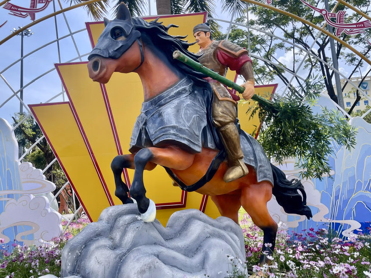 Theo quan sát của chúng tôi, phía bên trái quảng trường là chuỗi tiểu cảnh tôn vinh các giá trị truyền thống của Tết cổ truyền Việt Nam thông qua hình ảnh nhà tranh, bánh chưng, đồng thời kết hợp biểu tượng Thánh Gióng nhằm nhấn mạnh tinh thần lịch sử, ý chí vươn lên và niềm tự hào dân tộc.