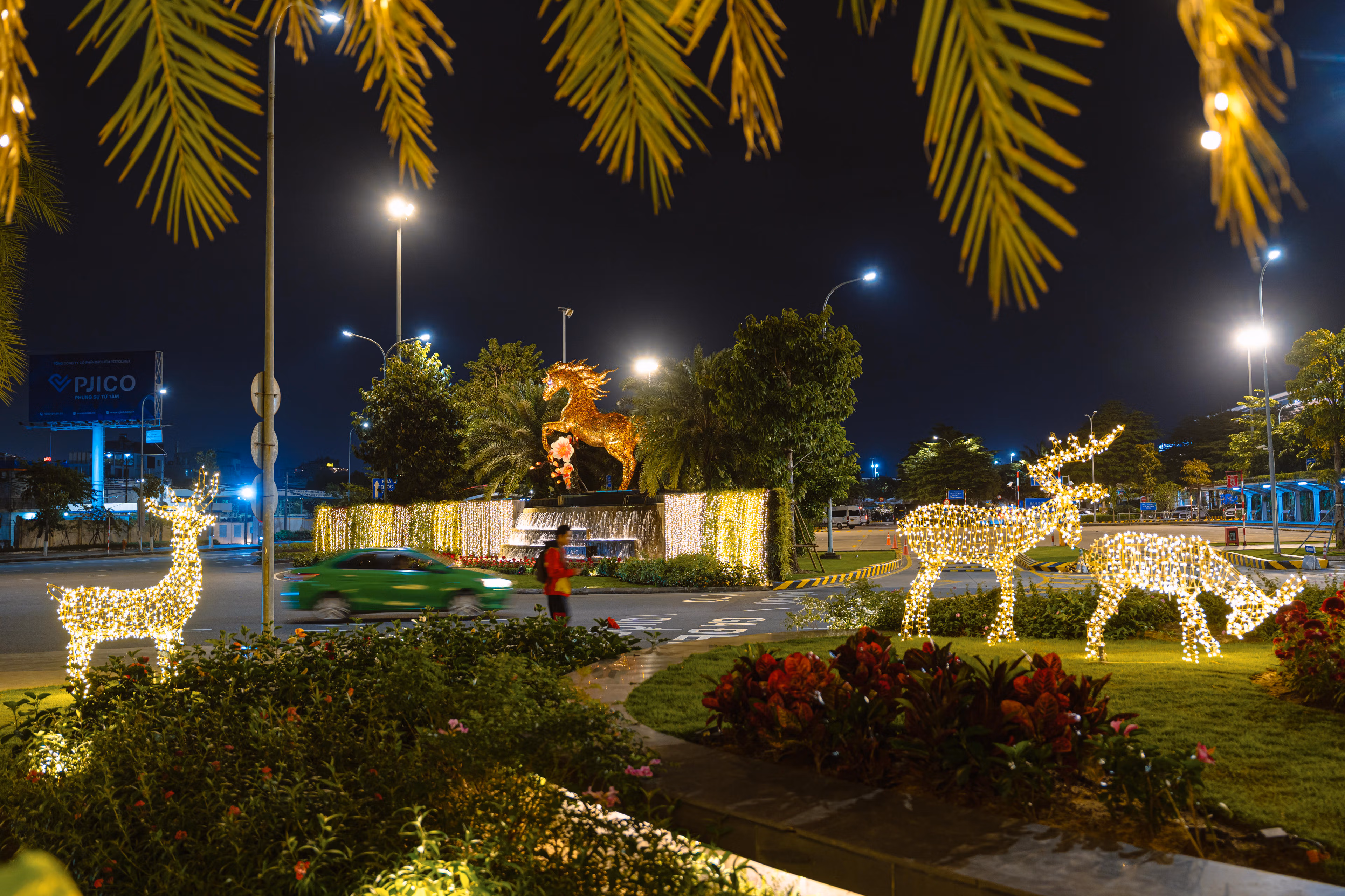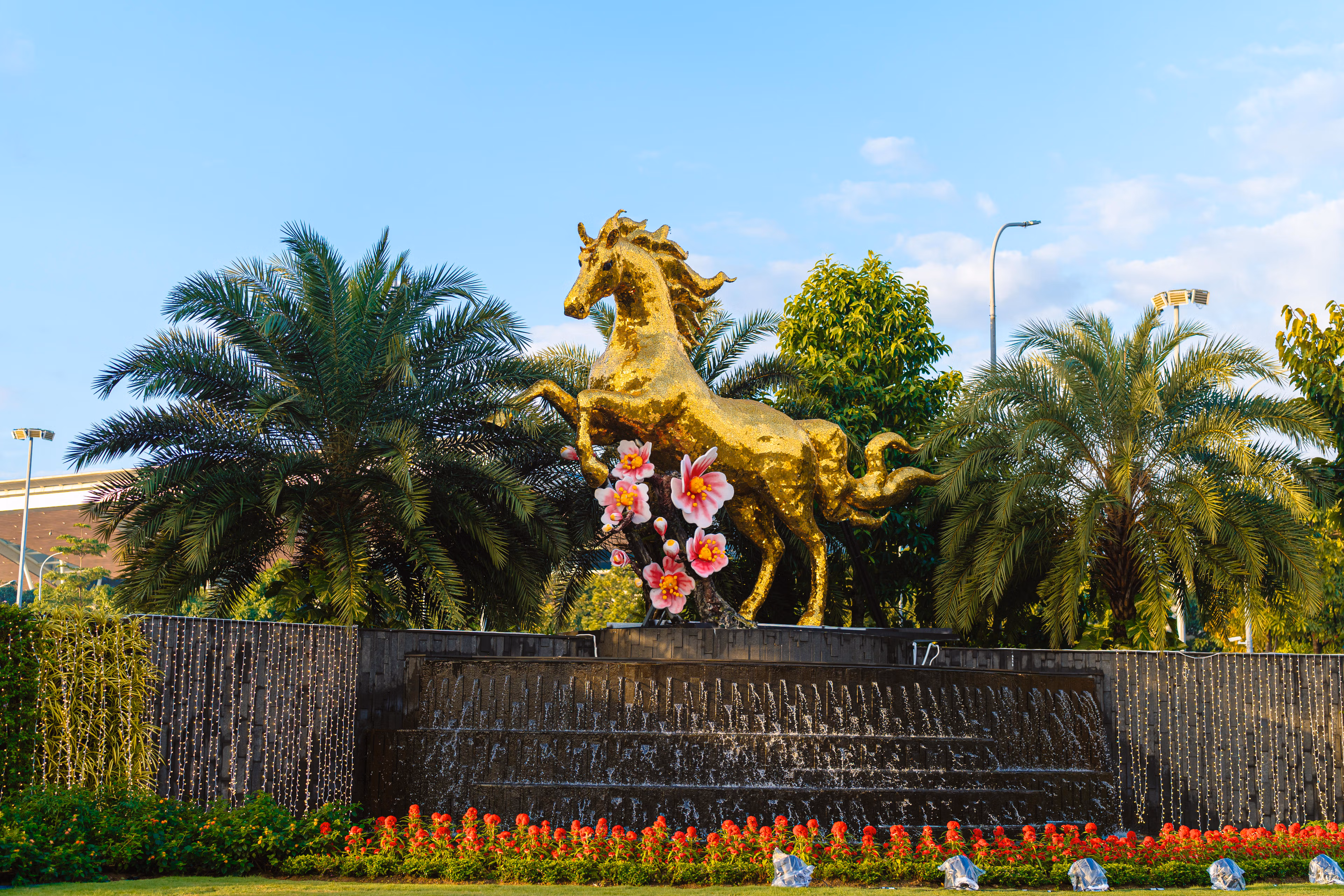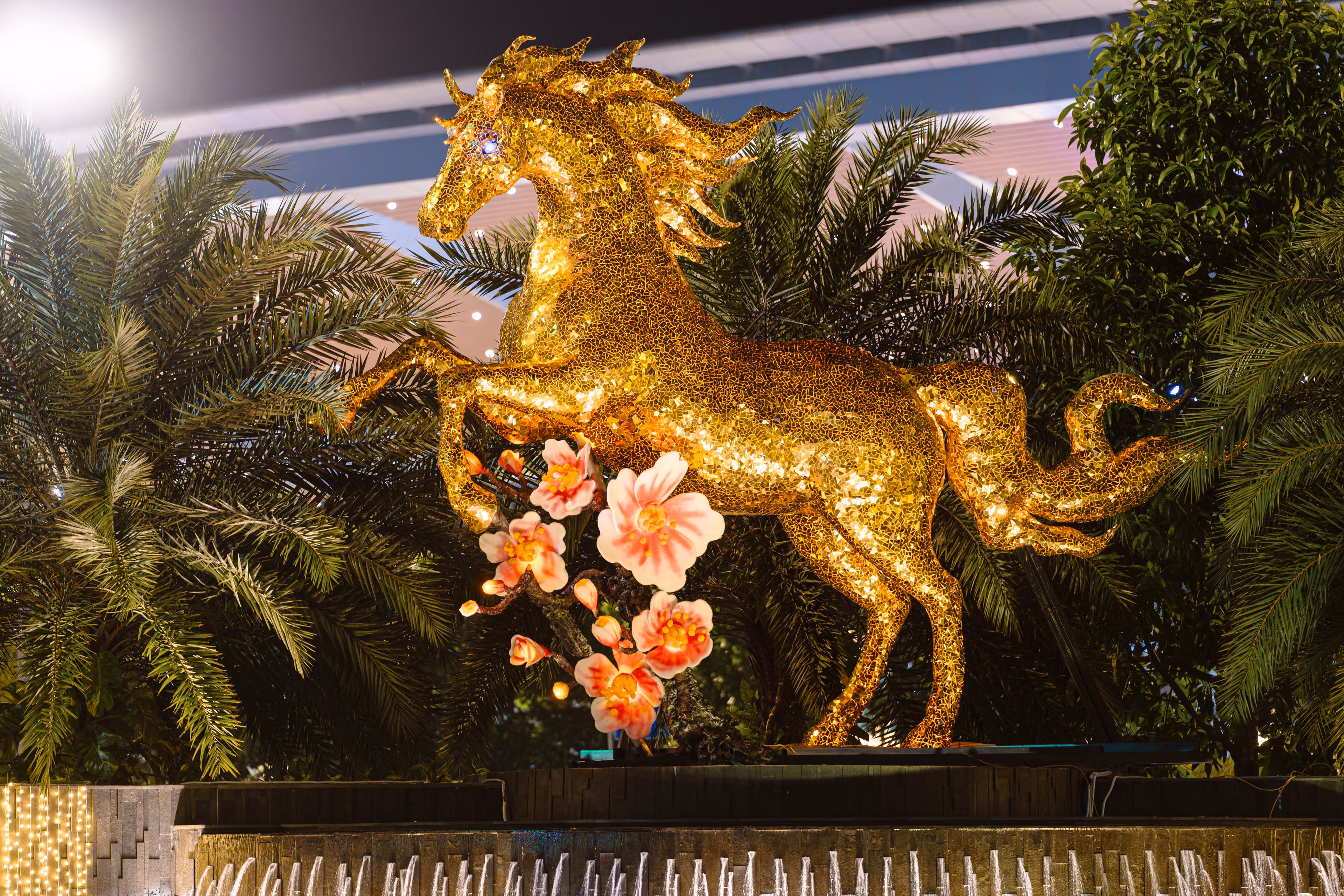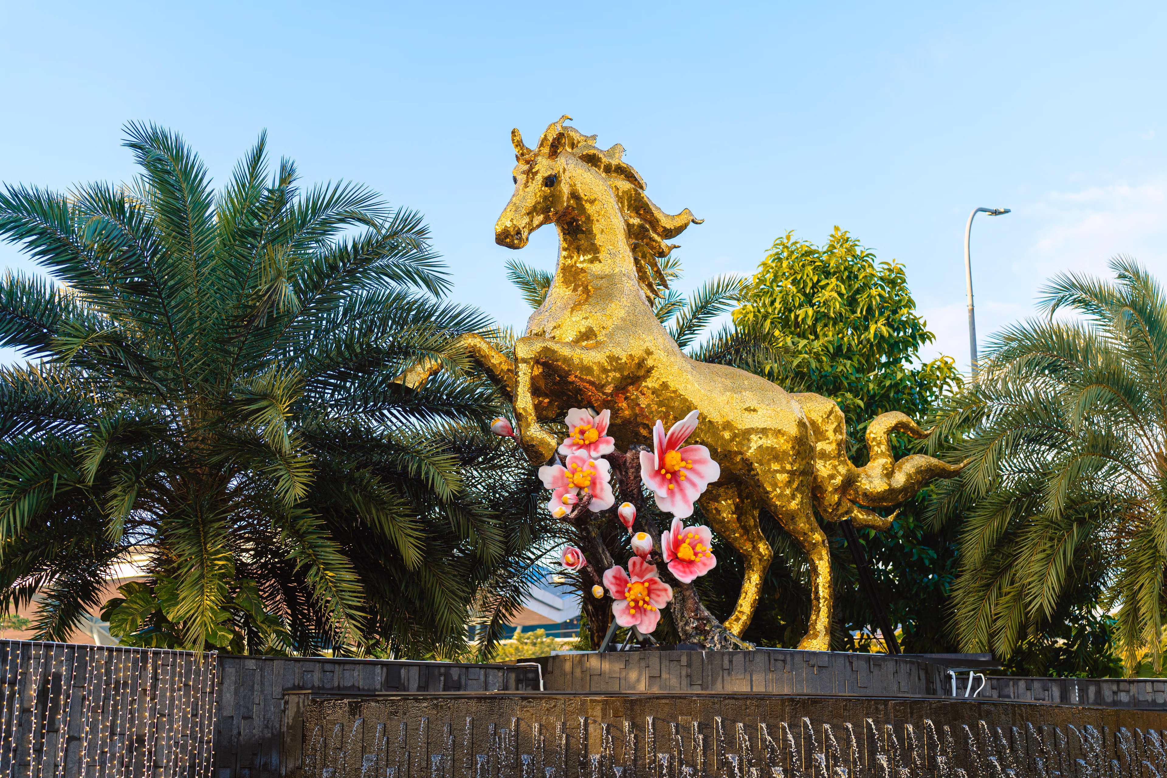 Linh vật Ngựa Vàng cao 5m dũng lãnh trên thác nước khu vực cửa ngõ Cảng hàng không quốc tế Đà Nẵng (đầu đường Nguyễn Văn Linh, phường Hòa Cường, TP Đà Nẵng) là điểm trang trí linh vật Xuân Bính Ngọ 2026 sớm nhất tại thành phố.