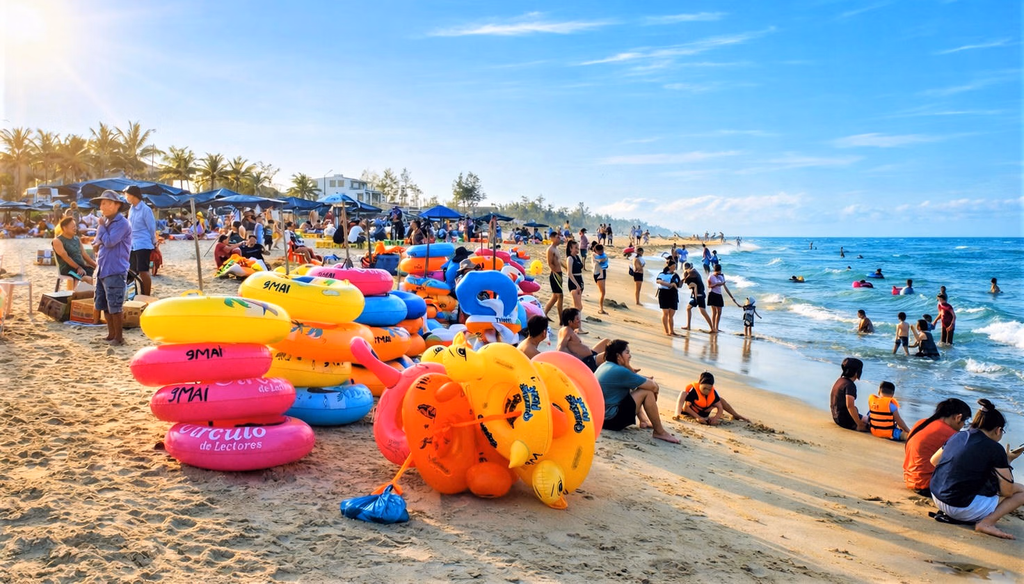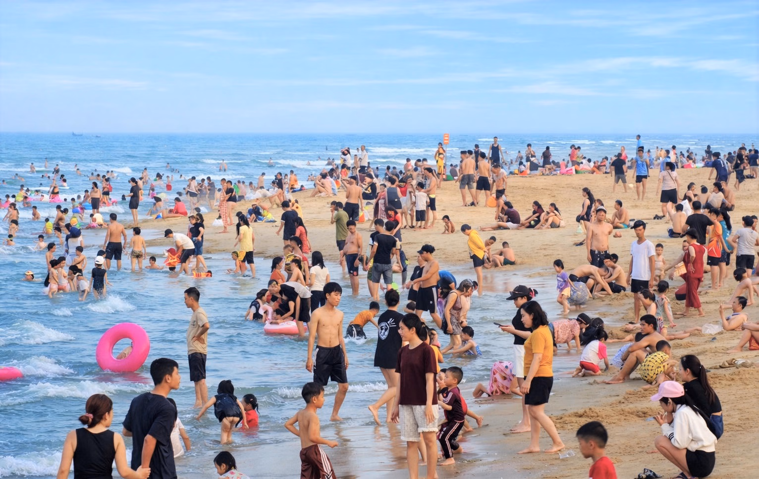 Bãi biển Tam Thanh trở nên đông nghịt từ sáng sớm đến chiều tối. Người dân tắm biển, vui chơi và tận hưởng làn nước mát lạnh, không khí trong lành. Không chỉ là điểm giải nhiệt lý tưởng, bãi biển còn mang đến không gian thư giãn, giúp xua tan cái oi bức trong những ngày cao điểm hè.