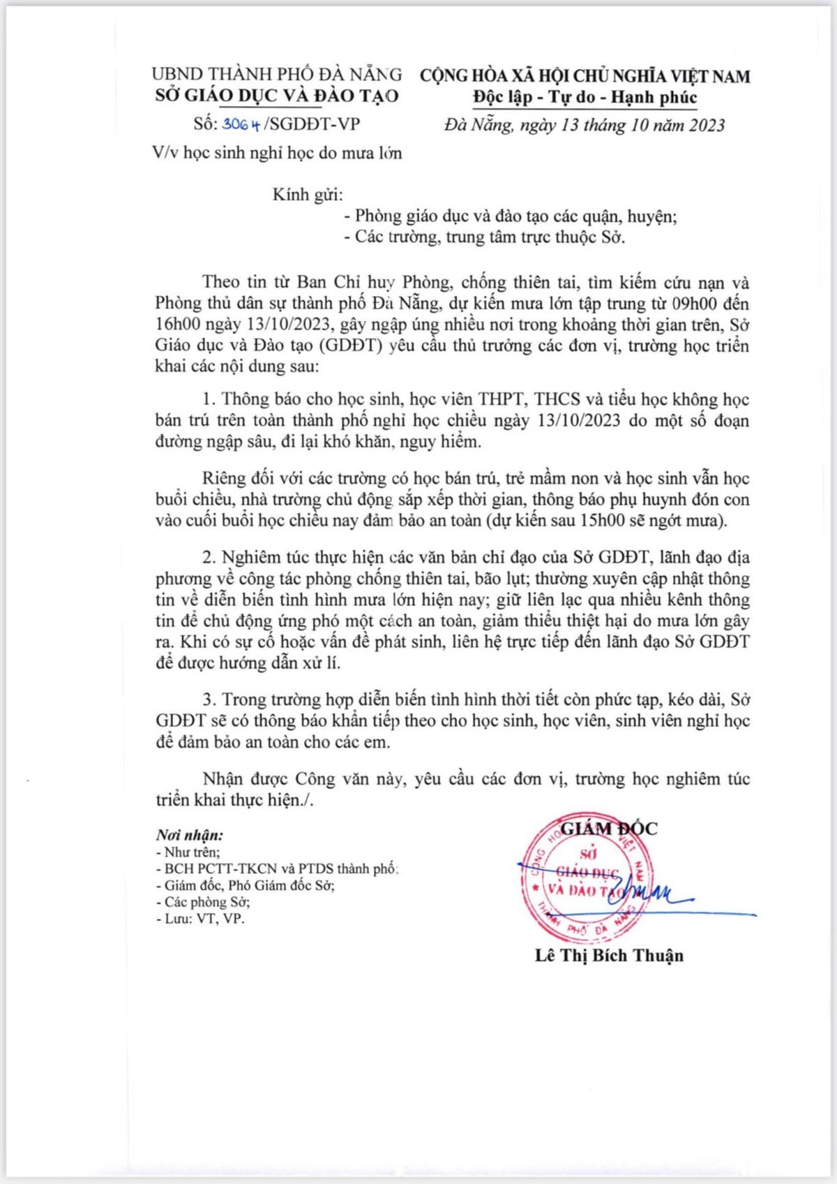 Trưa 13/10, Sở TT&TT Đà Nẵng gửi công văn khẩn (số 3064/SGDDT-VP) của Sở Giáo dục và Đào tạo TP Đà Nẵng đến các cơ quan báo chí trên địa bàn, thông báo về việc cho học sinh, học viên THPT, THCS và tiểu học không học bán trú trên toàn TP nghỉ học từ chiều ngày 13/10/2023 do một số đoạn đường ngập sâu, đi lại khó khăn, nguy hiểm.