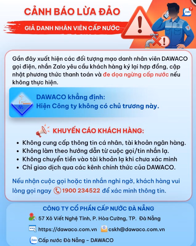 Để phòng tránh các hành vi giả mạo, lừa đảo, Dawaco đề nghị khách hàng chỉ tiếp nhận thông tin và liên hệ với công ty thông qua các kênh chính thức: Hotline chăm sóc khách hàng: 1900 234522; các Xí nghiệp Cấp nước: Khu vực 1 (220 Trần Phú, phường Hải Châu, điện thoại 0236 3822222); khu vực 2 (21–23 Đinh Châu, phường Cẩm Lệ, điện thoại 0236 3674674); khu vực 3 (01 Đinh Thị Hòa, phường An Hải, điện thoại 0236 3946946); khu vực 4 (40–42 Ngô Văn Sở, phường Liên Chiểu, điện thoại 0236 3733333); Văn phòng số 293 Ông Ích Khiêm (Xí nghiệp Cấp nước Thanh Khê cũ, điện thoại 0236 3868696); Văn phòng số 37 Trần Trọng Khiêm (Xí nghiệp Cấp nước Ngũ Hành Sơn cũ, điện thoại 0236 3951333).