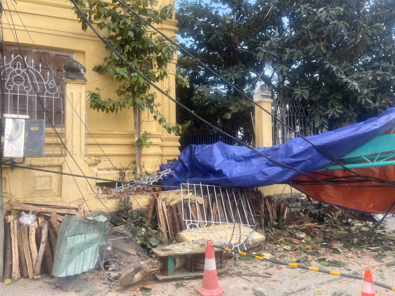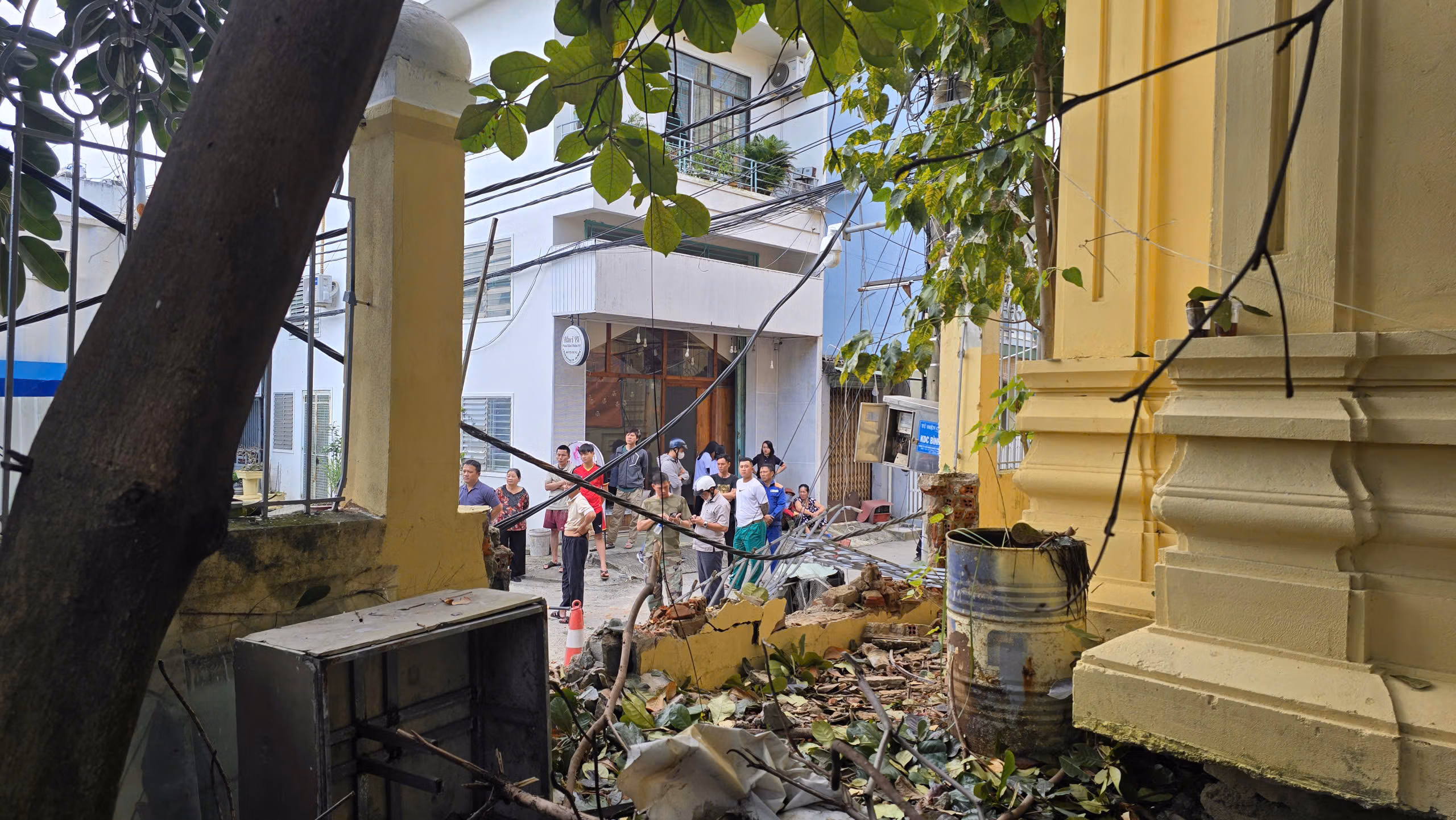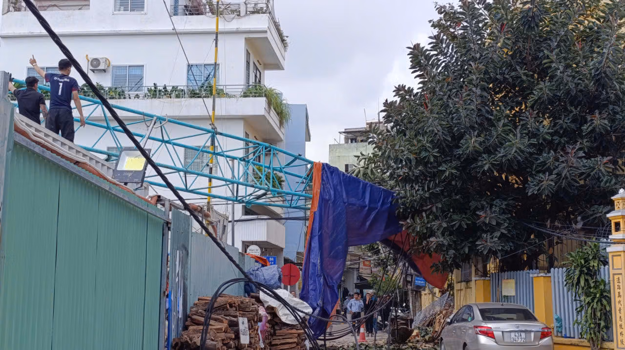 Đoạn cần cẩu từ bên trong khu vực công trình, bị gãy ngang và đổ ra khu vực mặt đường kiệt. Một đoạn tường bao của Bảo tàng điêu khắc Chăm bị cần cẩu đè sập.
