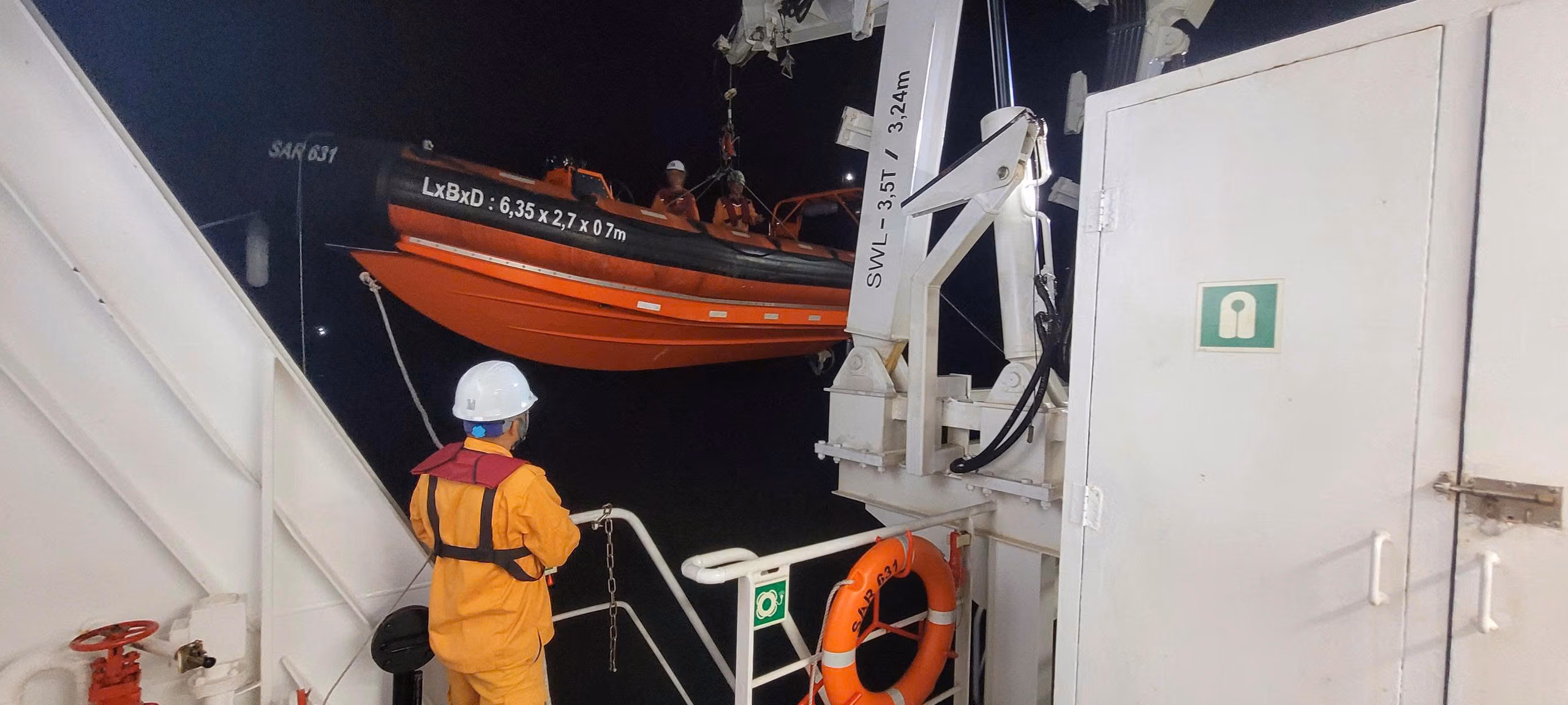 Tàu SAR 631 đã xuyên đêm, vượt qua điều kiện thời tiết khắc nghiệt với sức gió cấp 6 giật cấp 7-8, sóng cao từ 2-4 mét, tiếp cận đặc khu Cù Lao Chàm trong đêm khuya.
