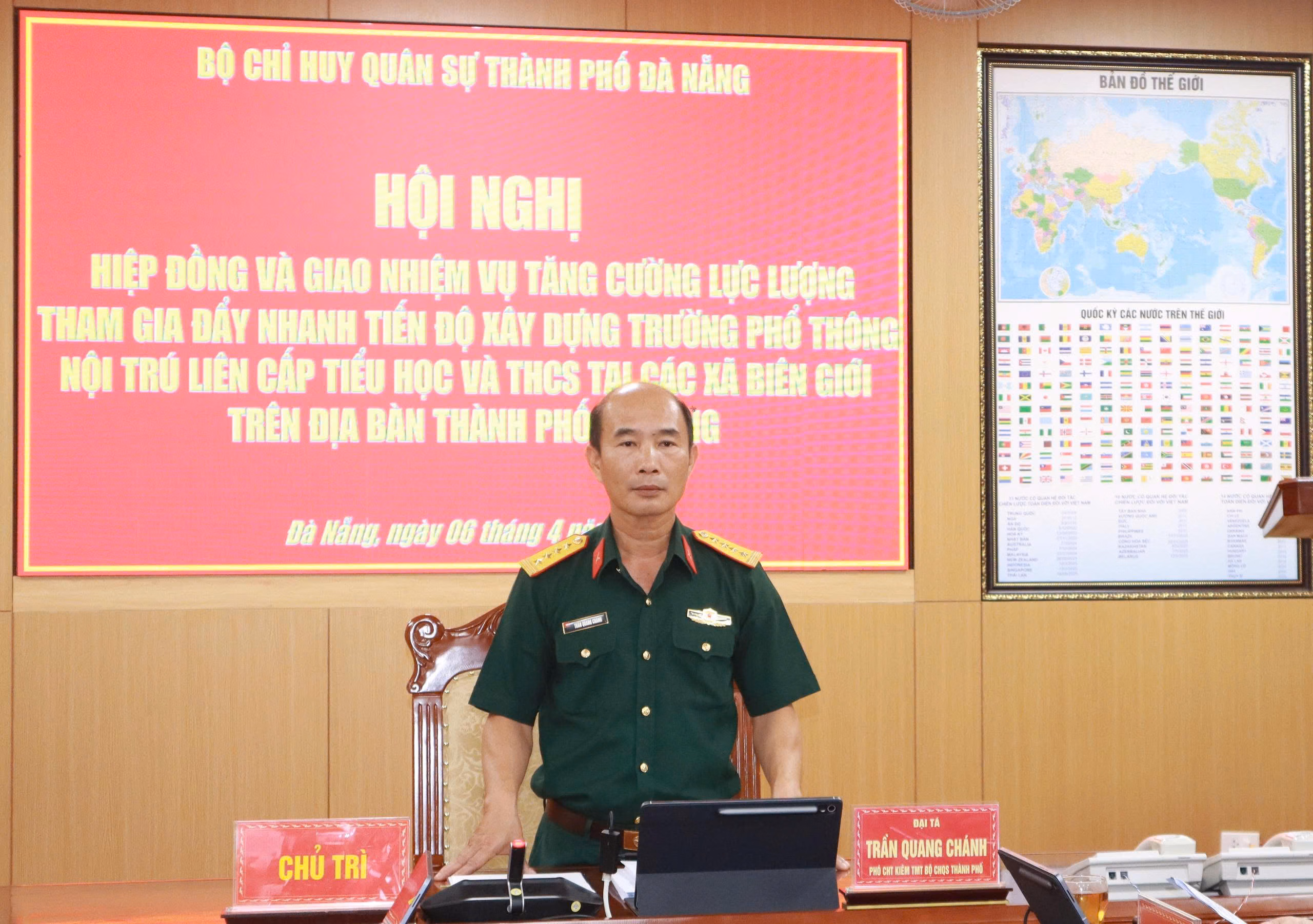 Ngày 6/4, Bộ CHQS TP Đà Nẵng tổ chức hội nghị giao nhiệm vụ cho lực lượng tham gia hỗ trợ đẩy nhanh tiến độ xây dựng Trường Phổ thông nội trú liên cấp Tiểu học và THCS tại các xã biên giới. Đại tá Trần Quang Chánh, Phó Chỉ huy trưởng kiêm Tham mưu trưởng Bộ CHQS thành phố chủ trì.
