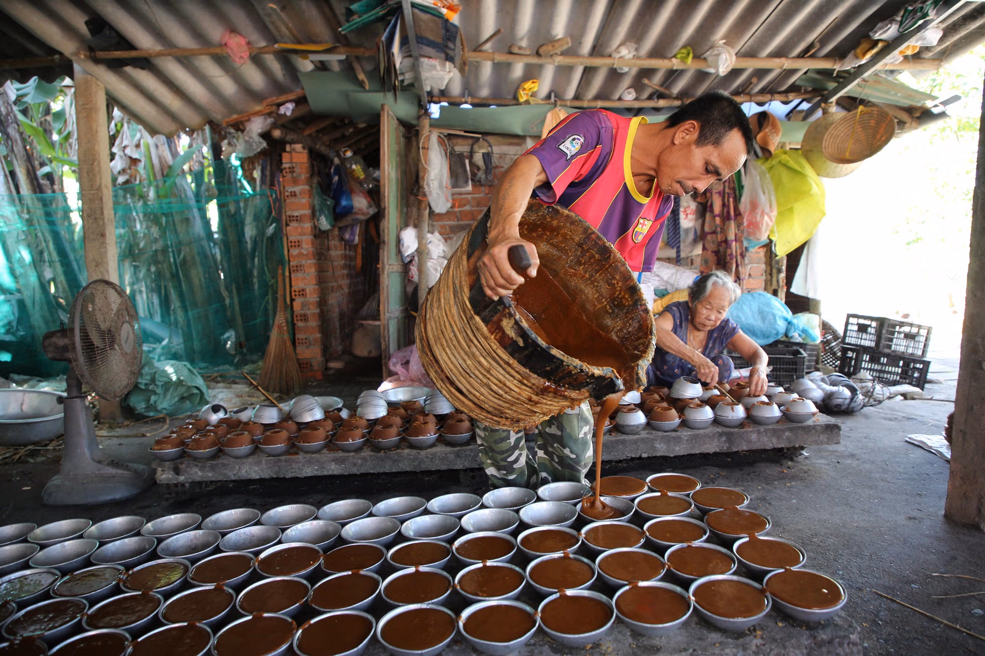 Đứng bên nồi gang sôi sùng sục, nhiệt độ tỏa ra hầm hập, ông Nhân phải liên tục khuấy đều tay. Ánh mắt ông không rời mặt nước mía đang chuyển dần từ màu vàng nhạt sang nâu đậm. Chỉ cần lỡ tay một chút, đường sẽ bị cháy hoặc không đủ độ kết dính.