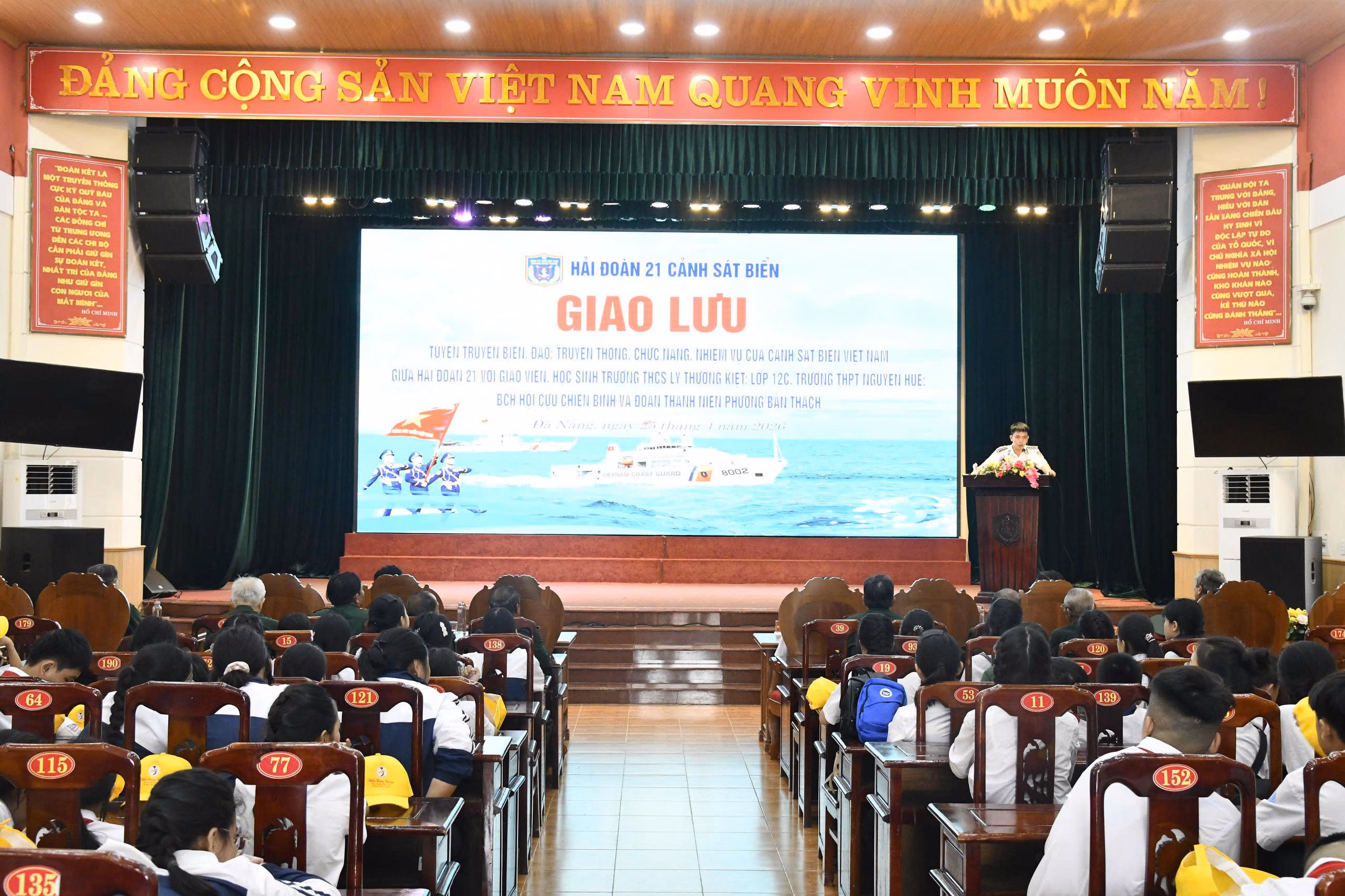 Tại buổi giao lưu, cán bộ Hải đoàn 21 đã cung cấp thông tin khái quát về tình hình biển, đảo Việt Nam; đồng thời giới thiệu truyền thống vẻ vang, vai trò, nhiệm vụ của lực lượng Cảnh sát biển trong thực thi pháp luật, bảo vệ chủ quyền, giữ gìn an ninh, trật tự, an toàn trên biển.