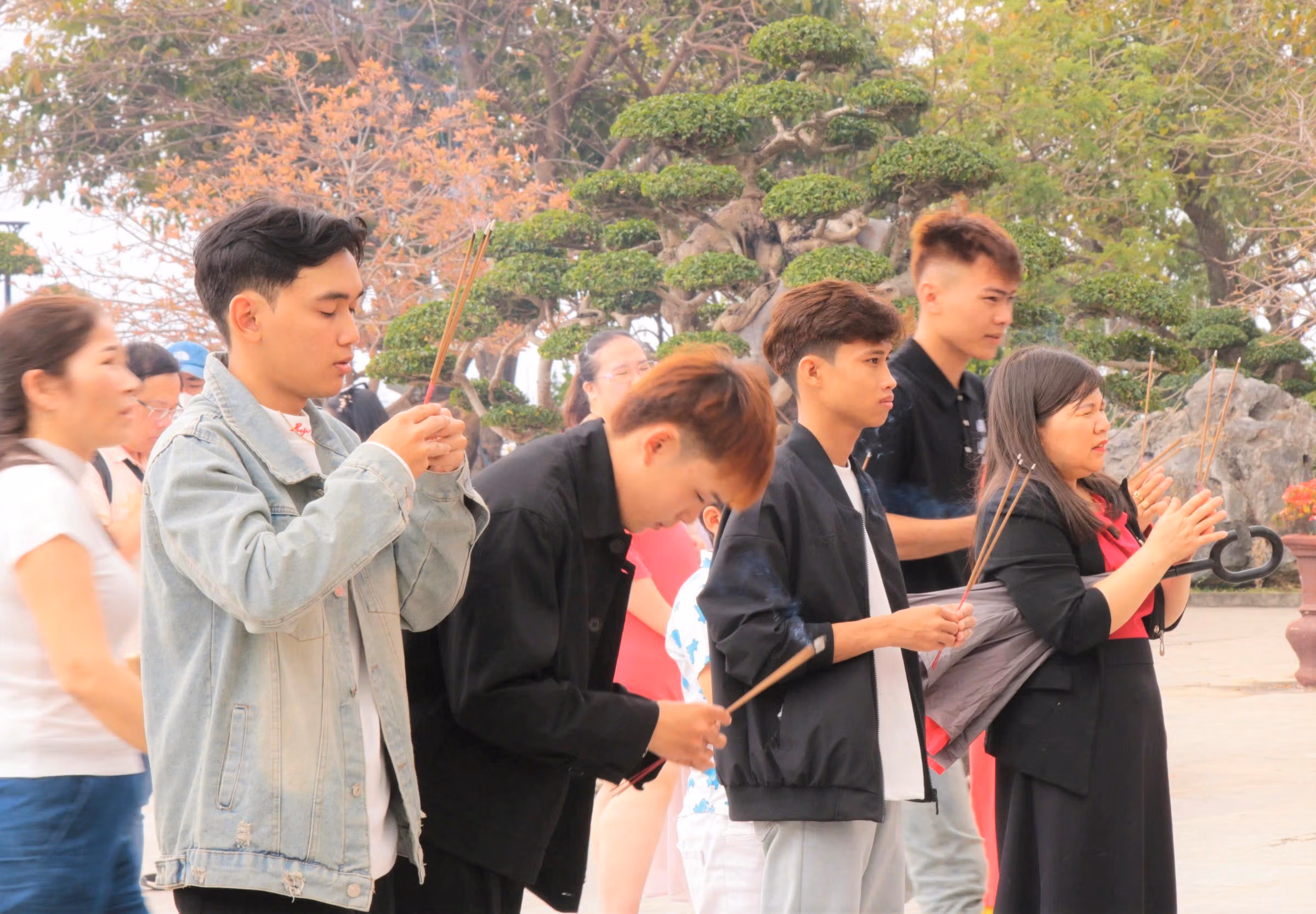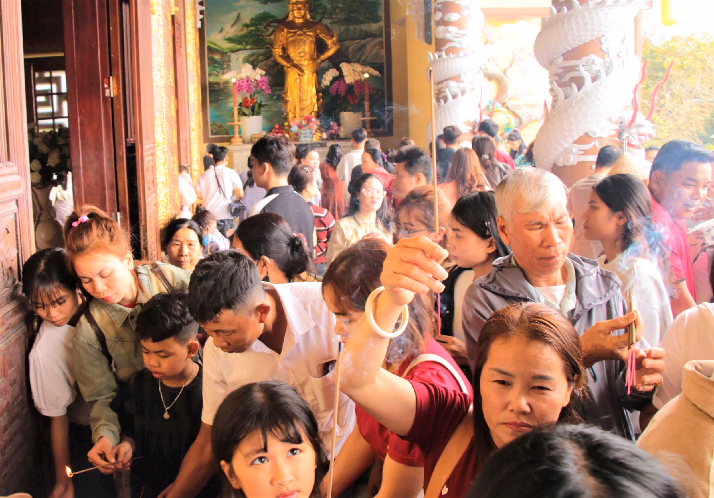 Bên trong khuôn viên, người dân lần lượt vào khu vực chính điện và sân tượng Quan Thế Âm để dâng hương, chiêm bái, cầu mong những điều tốt lành trong năm mới. Không khí trang nghiêm xen lẫn nhộn nhịp, tạo nên nét đặc trưng tại điểm đến tâm linh nổi tiếng mỗi dịp đầu xuân.