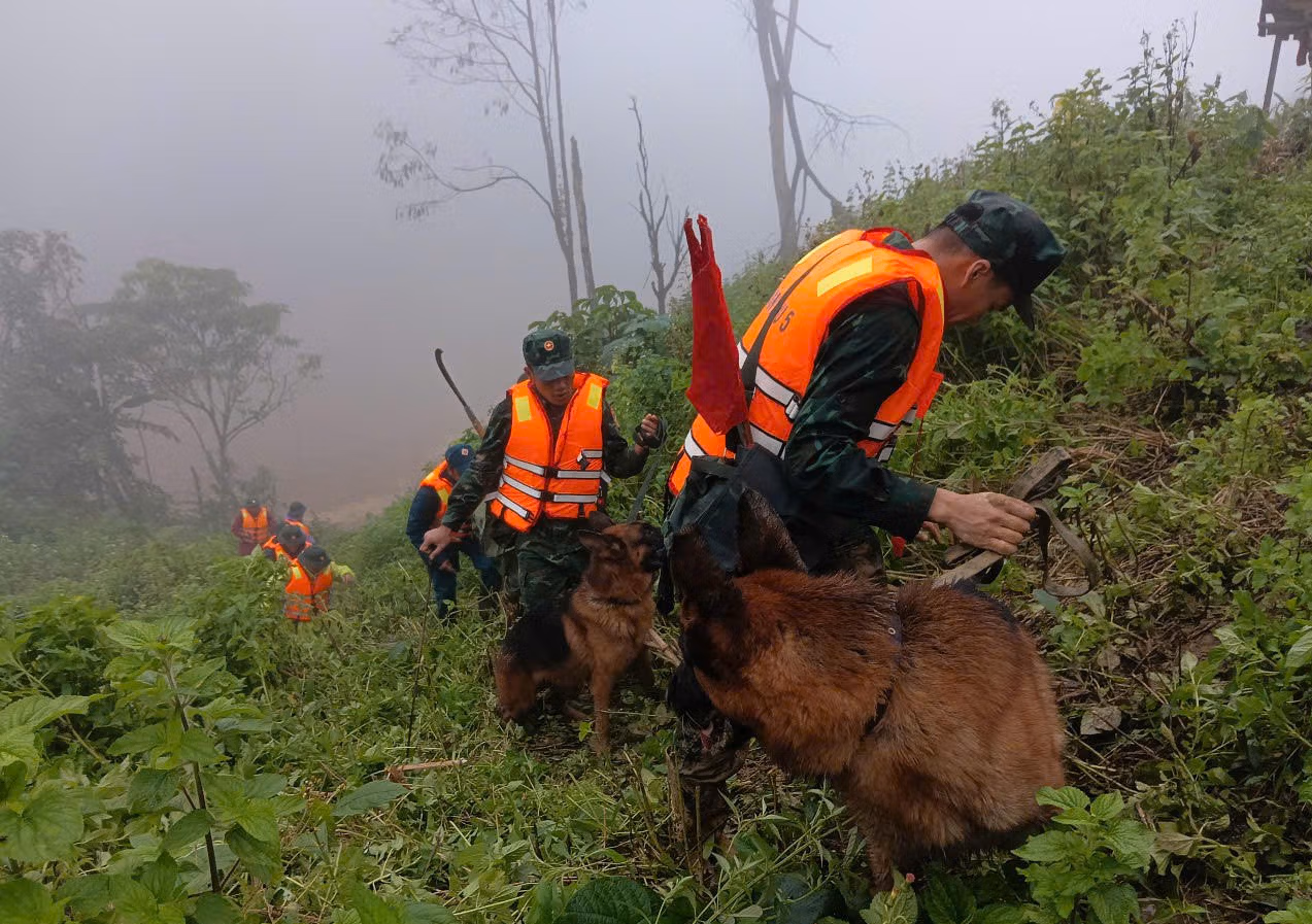 Ba chó nghiệp vụ được huy động để hỗ trợ khoanh vùng các vị trí nghi vấn dưới lớp đất đá dày. Các lực lượng chia thành nhiều tổ, rà soát các khe suối, chân taluy và những điểm bị vùi lấp.