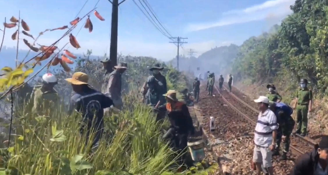 Khoảng 150 người được huy động để khống chế, dập tắt đám cháy cạnh đường sắt qua đèo Hải Vân thuộc địa bàn phường Hòa Hiệp Bắc, quận Liên Chiểu, Đà Nẵng.