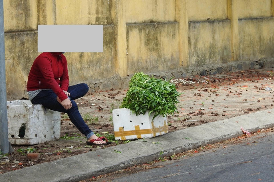Sáng 16/8, ở con đường vắng vẻ gần khu chợ đầu mối Hòa Cường, chúng tôi gặp một số phụ nữ bó gối ngồi dưới gốc cây. Chấp hành lệnh giãn cách, mỗi người chọn một gốc cây để ngồi và đặt trước mặt cái rổ nhỏ đựng rau muống, rai cải hoặc hoa quả chờ người qua lại ghé mua.