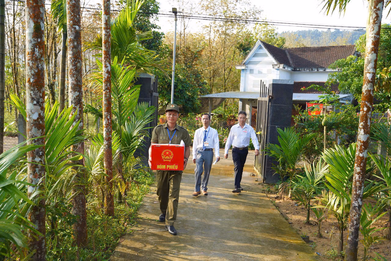 Không chỉ tại Sơn Cẩm Hà, ở những nóc xa của thôn Sông Y, xã Trà Tân, TP Đà Nẵng, nơi đường sá đi lại còn nhiều khó khăn, các tổ bầu cử cũng chủ động mang thùng phiếu phụ đến từng hộ gia đình.