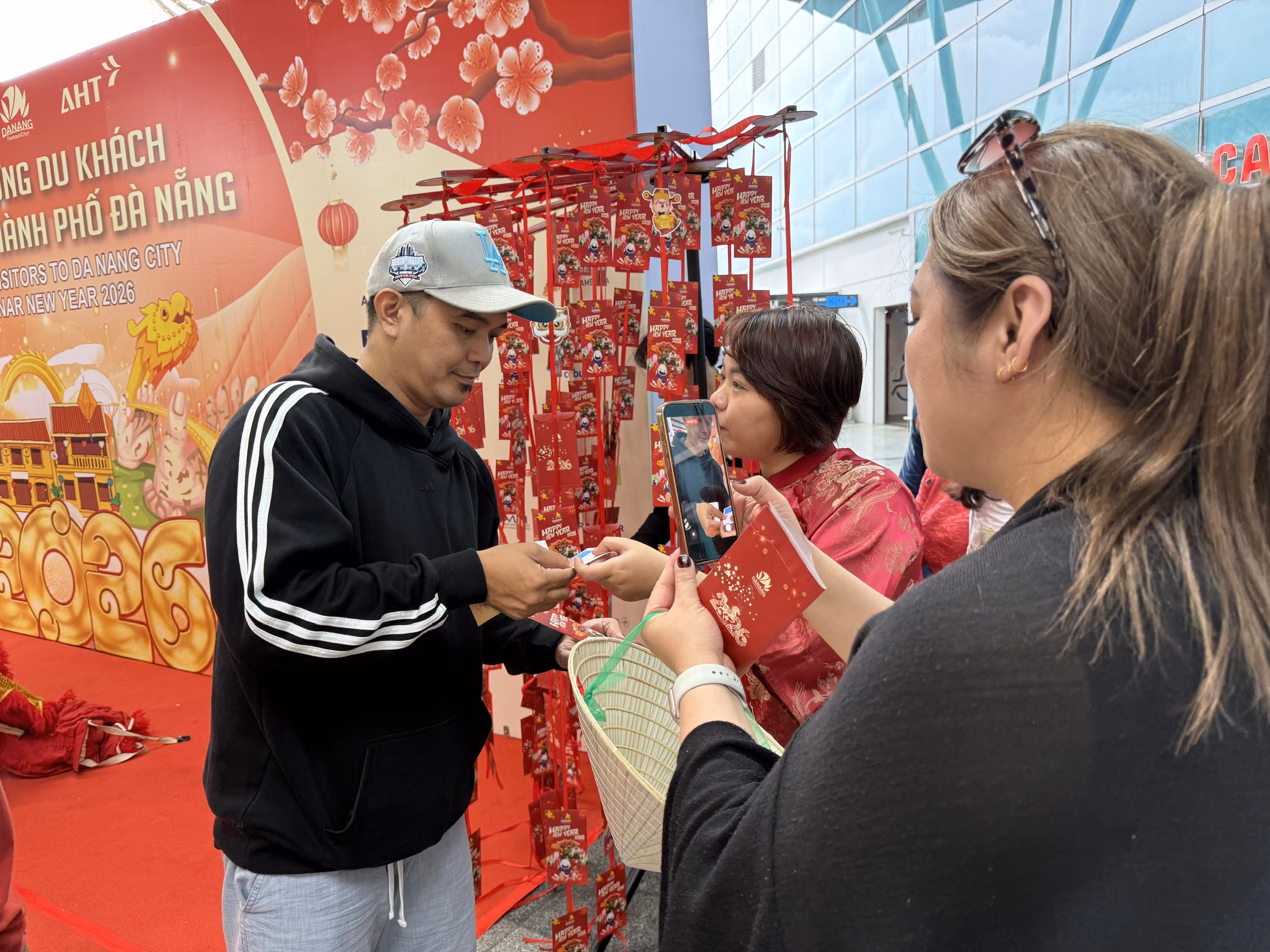 Tại ga đến Nhà ga hành khách quốc tế Cảng hàng không quốc tế Đà Nẵng tổ chức múa lân chào mừng, hái lộc may mắn, lì xì đầu năm, tặng những món quà mang đậm hương sắc Tết Việt như nón lá, đèn lồng, cà phê, bánh dừa…cho toàn bộ hơn 200 hành khách trên chuyến bay FD634 từ Băng Cốc (Thái Lan) đến tham quan, nghỉ dưỡng tại thành phố dịp tết này.