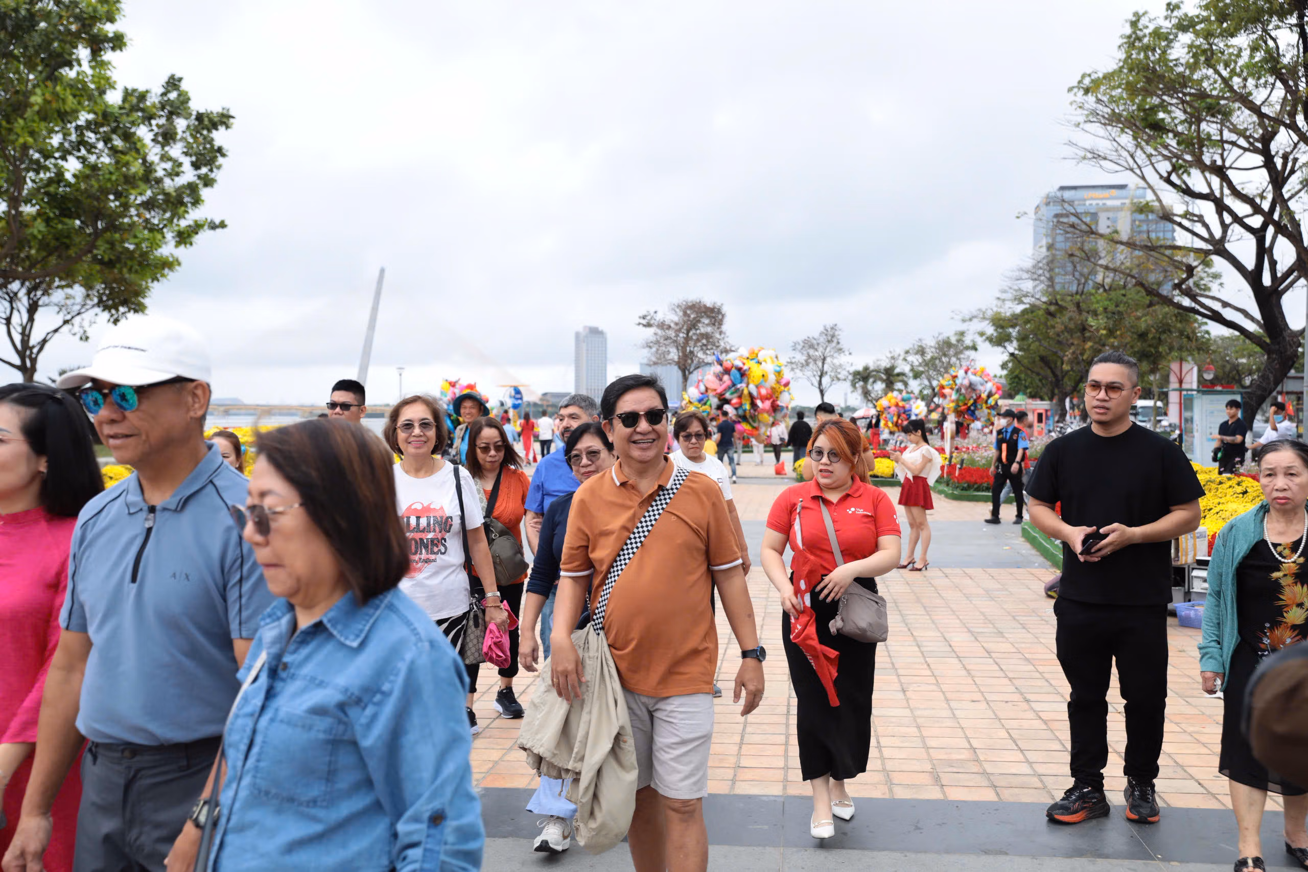 Trước đó, ngay từ sáng sớm, tại cầu Rồng - điểm trang trí tết có mô hình Kim Mã 4.0, cũng đã diễn ra hoạt động chào mừng đoàn du khách Philippines đón tết tại TP Đà Nẵng.