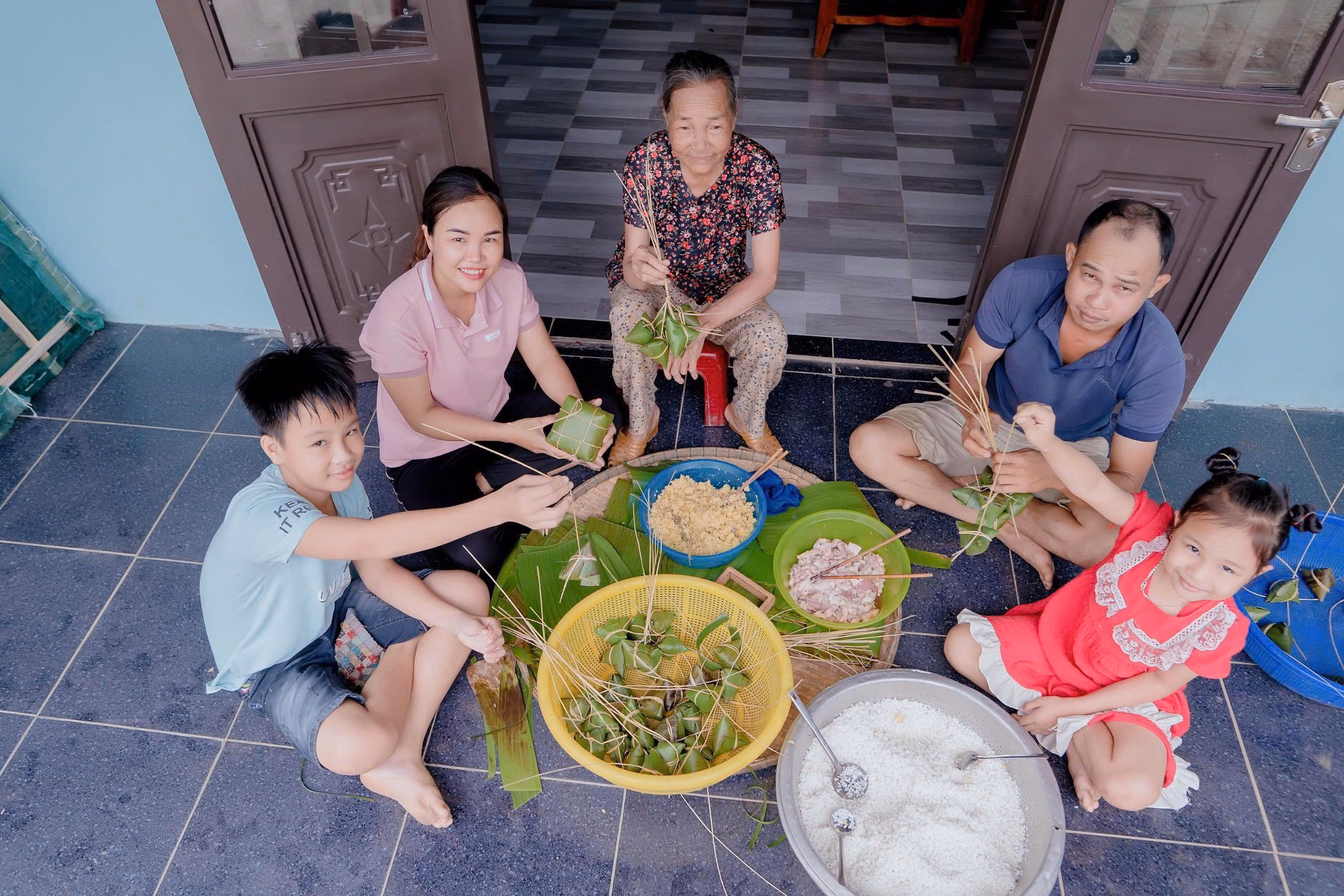 Gia đình chị Nguyễn Thị Hằng (thôn 3) vốn làm bánh chưng, bánh ú, bánh tét thường xuyên, nay tăng thêm nhân lực để phục vụ lễ hội.