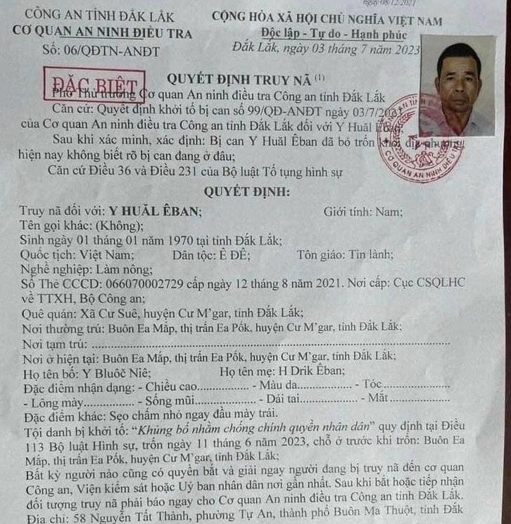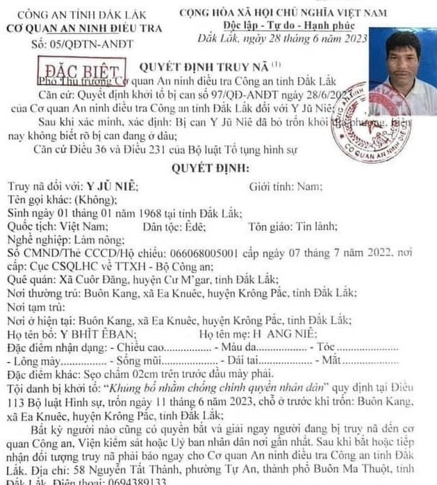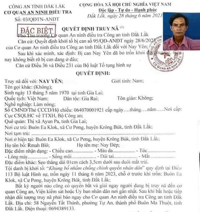 Các bị can bị truy nã đều trú tại tỉnh Đắk Lắk, gồm Y Khing Liêng (SN 1992, ngụ xã Hòa Sơn, huyện Krông Bông), Y Ju Niê (SN 1968, ngụ xã Ea Knuêc, huyện Krông Pắk), Y Huăl Êban (SN 1970, ngụ buôn Mấp, thị trấn Ea Pốk, huyện Cư M'gar), Nay Yên (SN 1970), Nay Tam (SN1974), Nay Dương (SN 1968), cùng ngụ xã Cư Pơng, huyện Krông Búk.