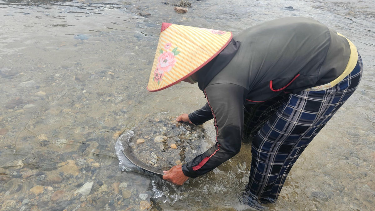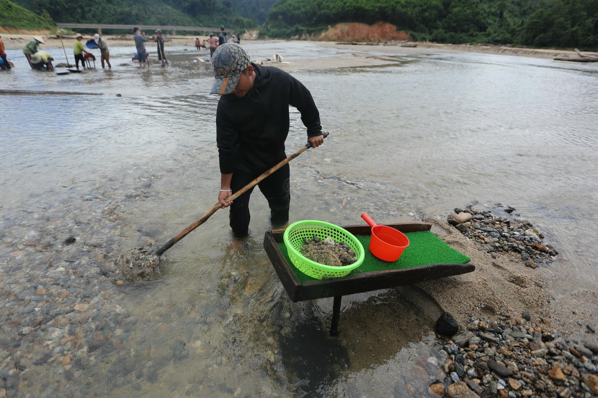 “Khi dùng máng đãi vàng thì đá, sỏi nằm lại ở trong rổ. Phía dưới rổ nhựa là máng nước đẩy cát trôi, vàng nằm lại ở tấm vải và thảm nhựa. Đãi khoảng vài chục phút trên máng, tôi đem tấm vải nhung rũ sạch vào mâm gang hình giống chiếc nón để tìm những hạt vàng cám li ti. Song chẳng mấy khi có vàng. Thế rồi tiếp tục phải làm lại, kiên nhẫn thì mới có thu nhập” - anh Đào nói.