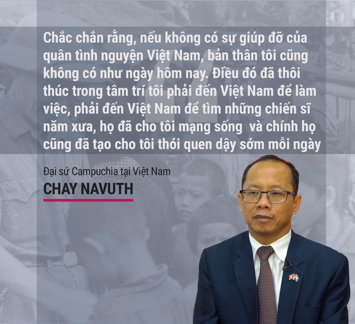 Đặc biệt, Đại sứ Vương quốc Campuchia Chay Navuth trong phần phỏng vấn đã luôn nhắc đến câu chuyện về tình bạn. Ông Chay Navuth chia sẻ về ký ức tuổi thơ của mình khi ông 9 tuổi. Tại thời điểm đó, ông được cha đưa tới tỉnh Prey Veng sát biên giới Việt Nam nhằm tránh sự bạo tàn của Khmer Đỏ. Nhờ sự giúp đỡ của lính tình nguyện Việt Nam mà gia đình ông đã vượt qua những tháng ngày khó khăn, hiểm nguy nhất.