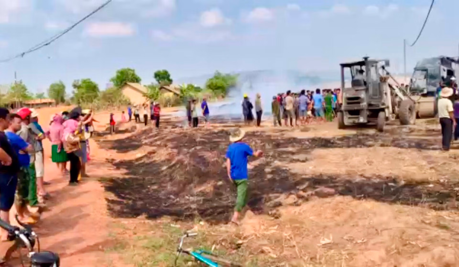 Thời điểm này, phía gầm đầu xe bất ngờ phát ra tiếng nổ rồi ngọn lửa bùng lên. Phát hiện hỏa hoạn, các nhân công tạm dừng việc bốc xếp củi, dùng nước, cát, đất triển khai dập lửa và điện báo cho cơ quan chức năng.