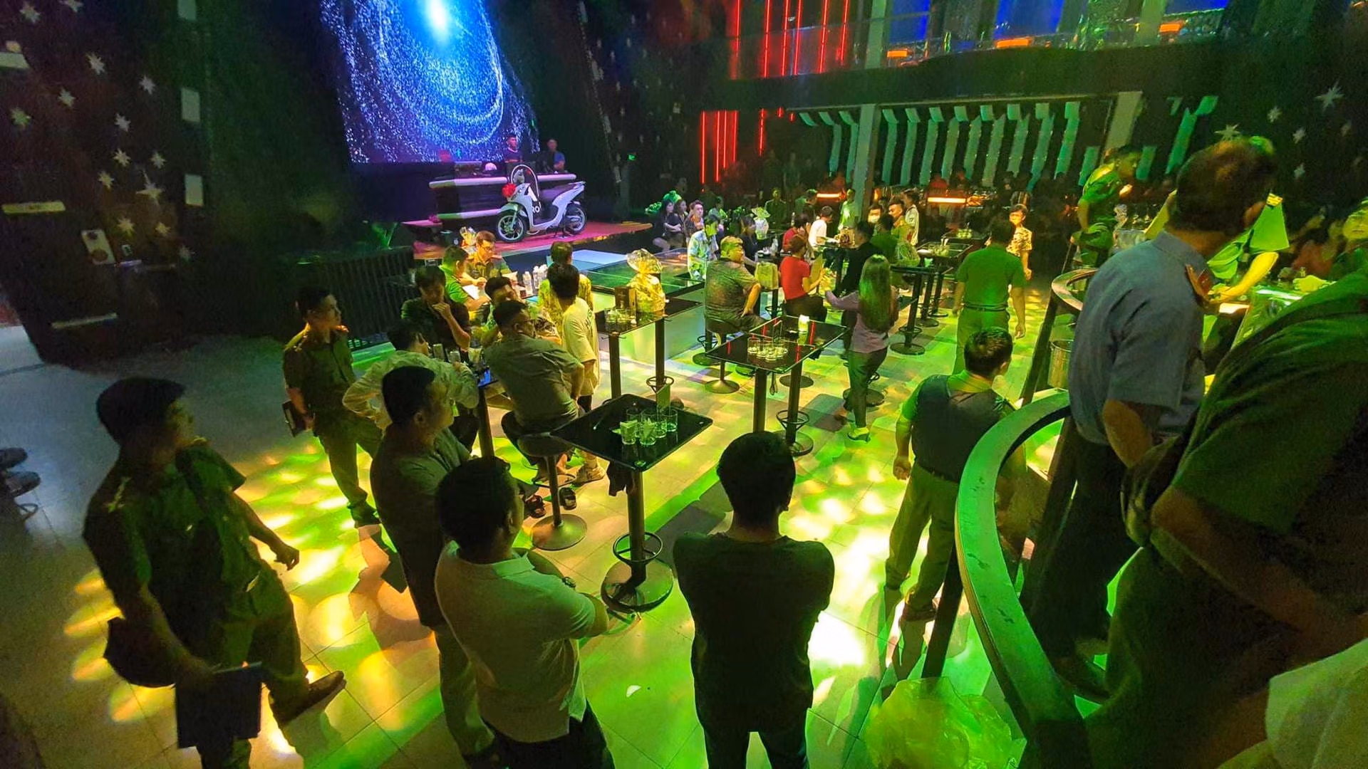 Khám xét tại các bàn, Công an thu giữ khoảng 5 gram ma túy loại Ketamin, 6 gram ma túy thuốc lắc, 3 bình khí cười cùng một số vật chứng khác có liên quan. Qua điều tra ban đầu, Công an xác định các đối tượng ngồi trong 3 bàn Vip 1, 8 và 9 đã có hành vi tổ chức sử dụng trái phép chất ma túy.
