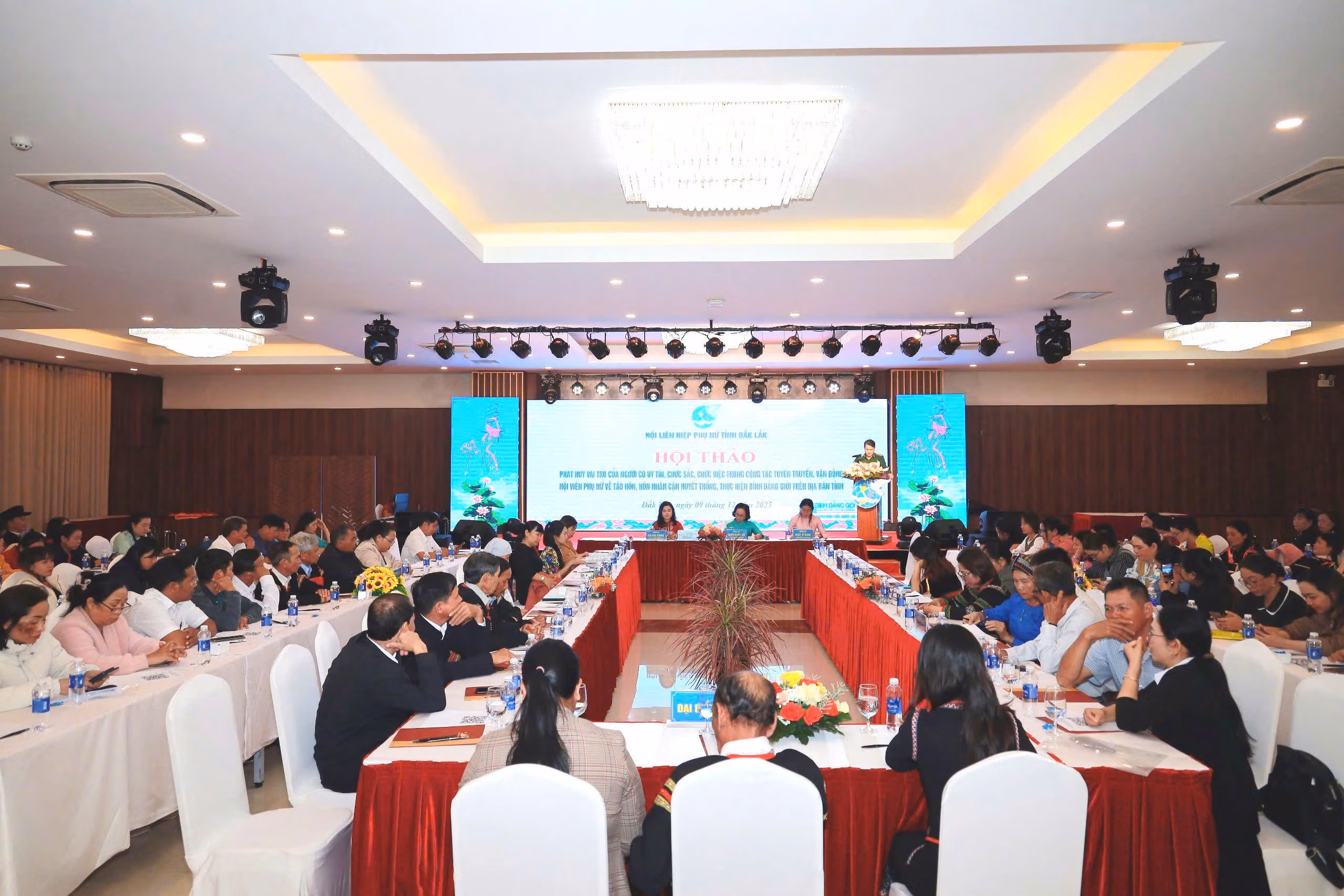 Sáng 9/12, Hội LHPN tỉnh Đắk Lắk tổ chức Hội thảo: “Phát huy vai trò của người có uy tín, chức sắc, chức việc trong công tác tuyên truyền, vận động hội viên phụ nữ phòng chống tảo hôn, hôn nhân cận huyết thống và thực hiện bình đẳng giới trên địa bàn tỉnh”.