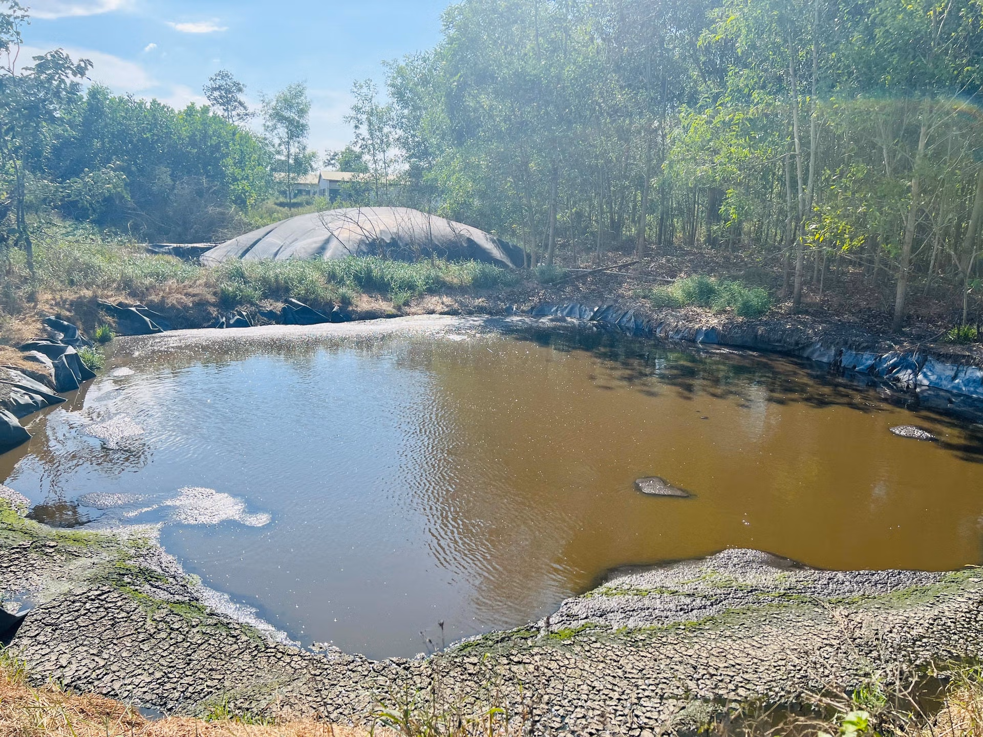 Khu vực xử lý chất thải có 3 cái ao lót bạt chứa nước thải từ hầm biogas đen quánh, bốc mùi hôi nồng nặc. Kề bên ao chứa nước thải là hồ nước tưới cà phê của người dân trong vùng. Nước của hồ cũng bị ô nhiễm đen ngòm, những cây bèo tây trên mặt hồ đều bị vàng úa.