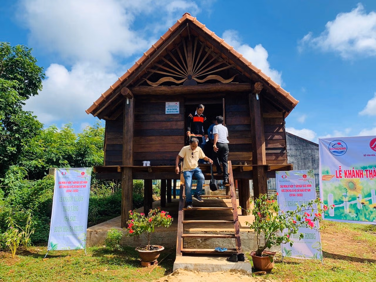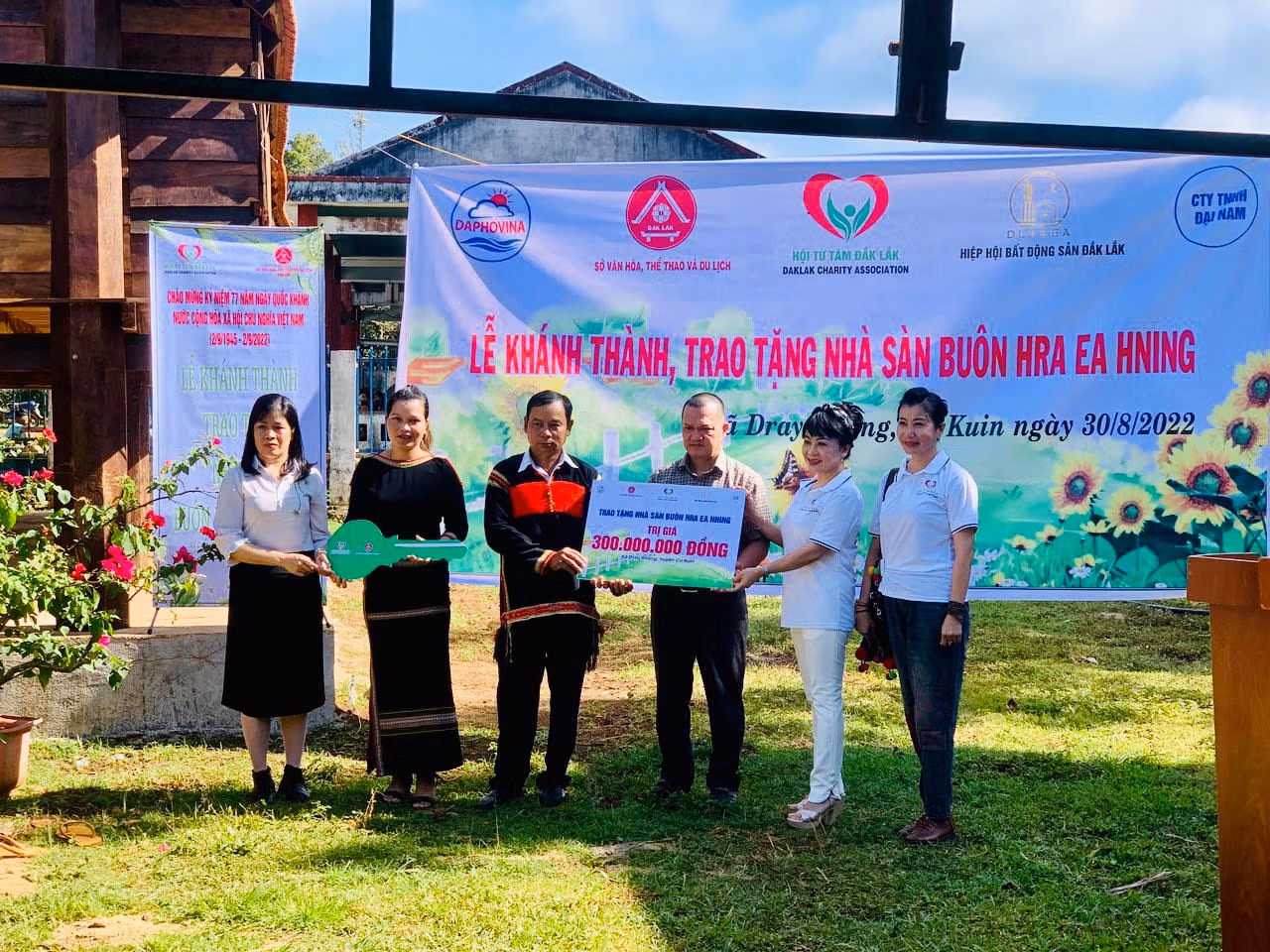 Ngôi nhà sàn tình nghĩa đã được khánh thành và trao tặng cho bà con buôn Hra Ea Hning, xã Dray Bhăng đúng vào dịp chào mừng Kỷ niệm 77 năm Quốc khánh 2-9 nên các đồng chí lãnh đạo Tỉnh ủy Đắk Lắk và các ban, sở, ngành của tỉnh đã về dự, chung vui với bà con trong buôn.