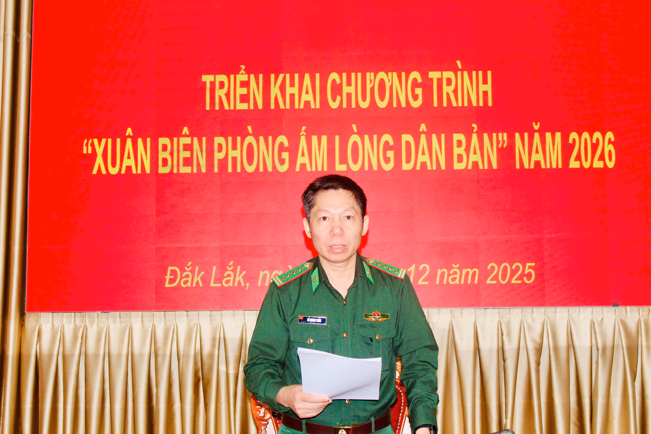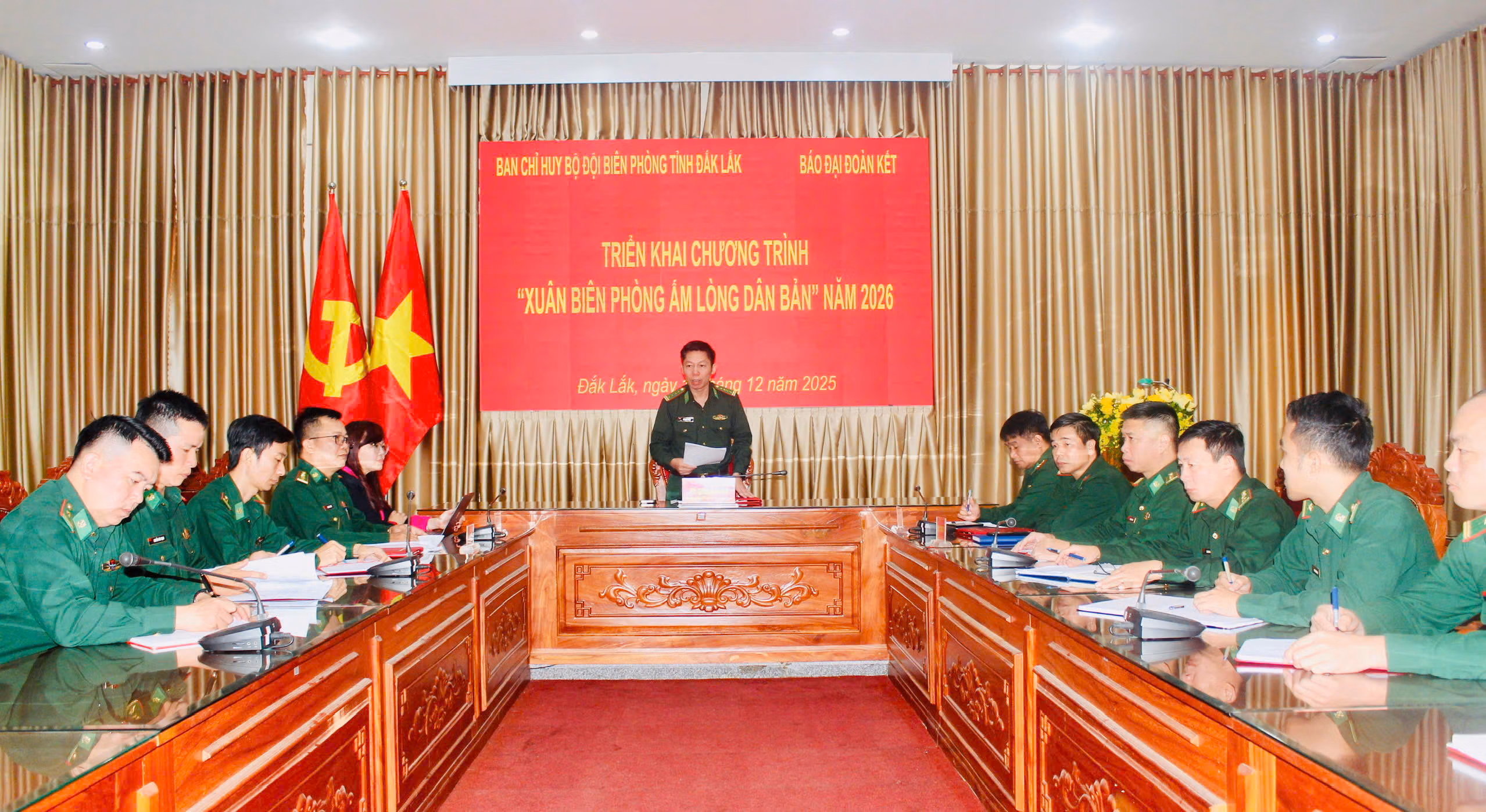 Ngày 10/12, Bộ đội Biên phòng (BĐBP) tỉnh Đắk Lắk phối hợp với Báo Đại đoàn kết tổ chức cuộc họp triển khai Chương trình “Xuân Biên phòng – Ấm lòng dân bản” năm 2026 – một trong những hoạt động an sinh - đối ngoại biên giới có sức lan tỏa mạnh mẽ nhất của lực lượng BĐBP trong nhiều năm qua. Cuộc họp do Đại tá Đỗ Quang Thấm, Phó Chính ủy Bộ Chỉ huy Quân sự tỉnh, kiêm Chính ủy BĐBP Đắk Lắk chủ trì.