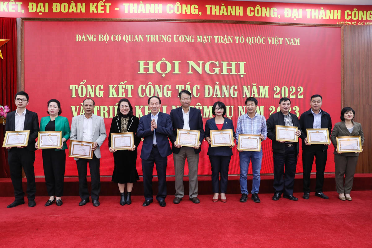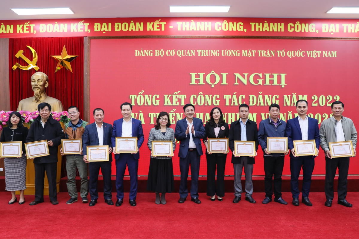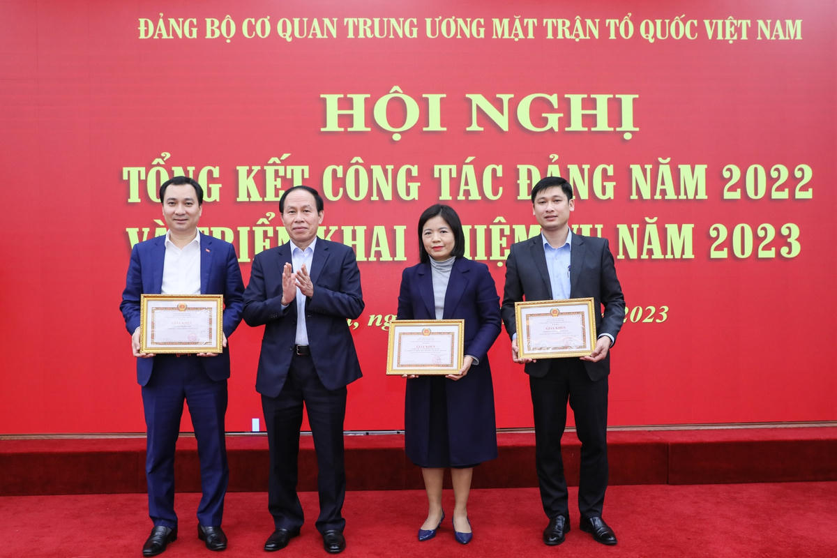 Tại Hội nghị, Đảng ủy cơ quan Trung ương MTTQ Việt Nam đã công bố và trao quyết định khen thưởng các chi bộ hoàn thành xuất sắc nhiệm vụ đạt danh hiệu chi bộ “Trong sạch, vững mạnh” tiêu biểu năm 2022; công bố và trao quyết định khen thưởng đảng viên “Hoàn thành xuất sắc nhiệm vụ” năm 2022.