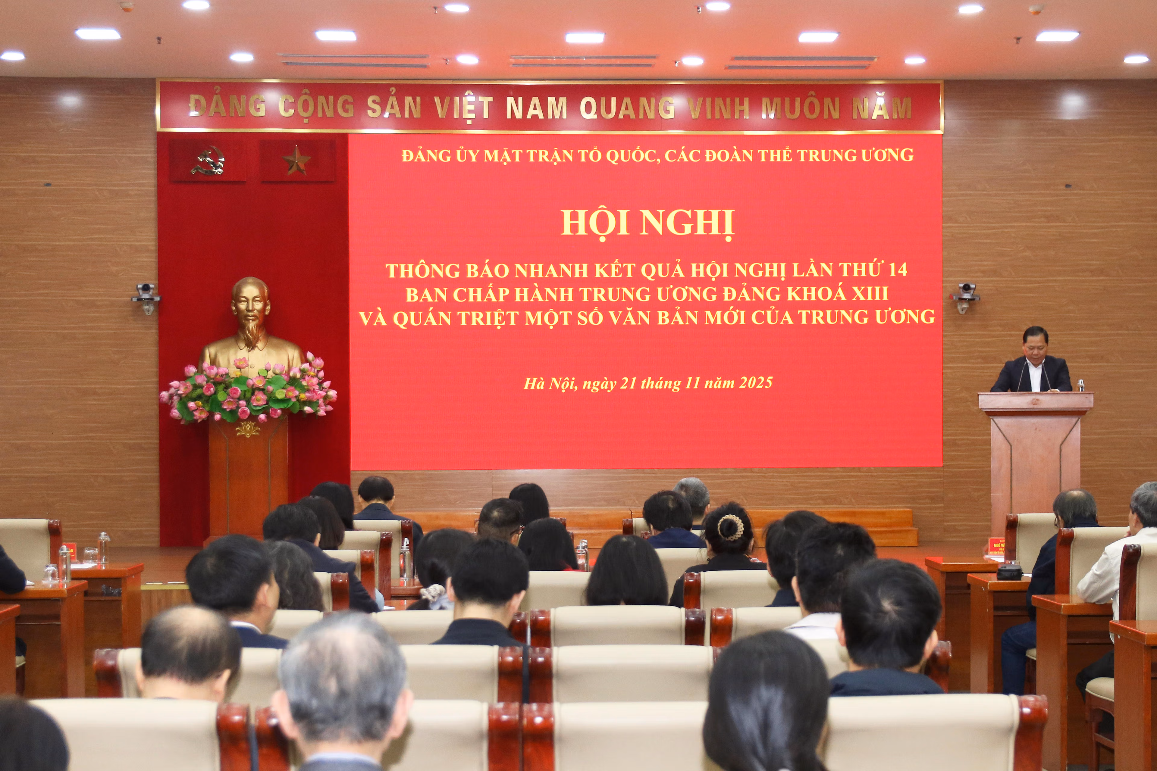 Sáng 21/11, tại Hà Nội, Đảng ủy MTTQ, các đoàn thể Trung ương tổ chức Hội nghị thông báo nhanh kết quả Hội nghị lần thứ 14 Ban Chấp hành Trung ương Đảng khóa XIII và quán triệt một số văn bản mới của Trung ương.