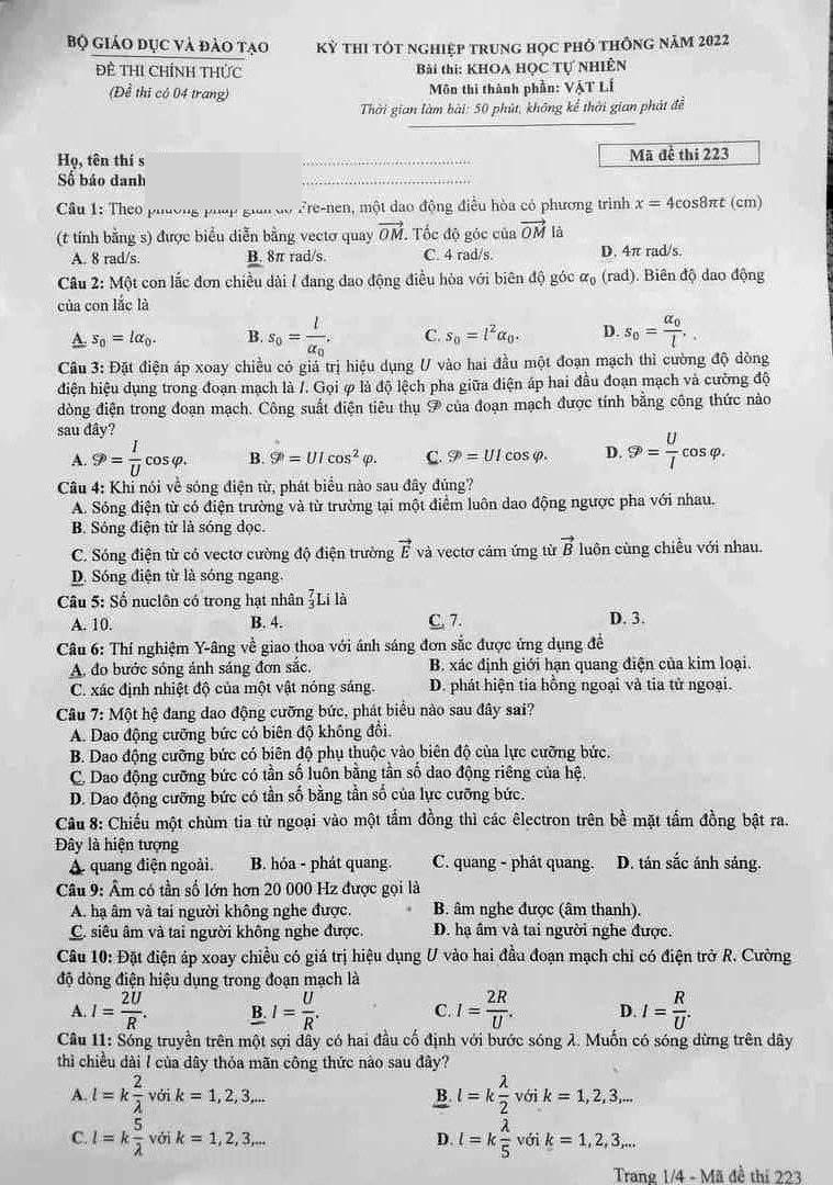 Thí sinh đã hoàn thành môn Vật lý – môn thi đầu tiên của bài thi Khoa học tự nhiên, Kỳ thi tốt nghiệp THPT 2022 với 40 câu hỏi trắc nghiệm. Dưới đây là gợi ý đáp án từ ban chuyên môn Tuyensinh247.