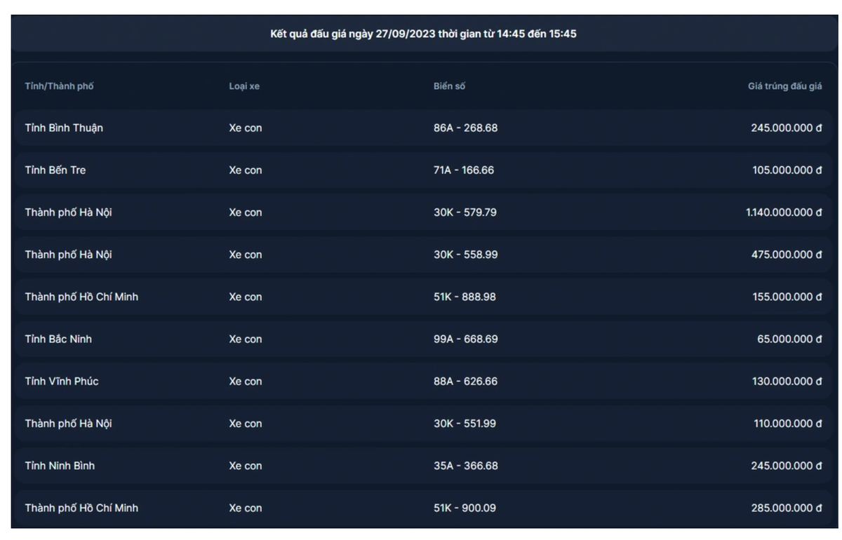 Kết quả đấu giá biển số ô tô chiều 27/9: Biển số 30K-569.99 trúng đấu giá với số tiền 345 triệu đồng. Biển số 30K-568.99 trúng đấu giá với số tiền 630 triệu đồng. Biển số 60K-368.68 trúng đấu giá với số tiền 605 triệu đồng. Biển số 51K-969.99 trúng đấu giá với số tiền 290 triệu đồng.