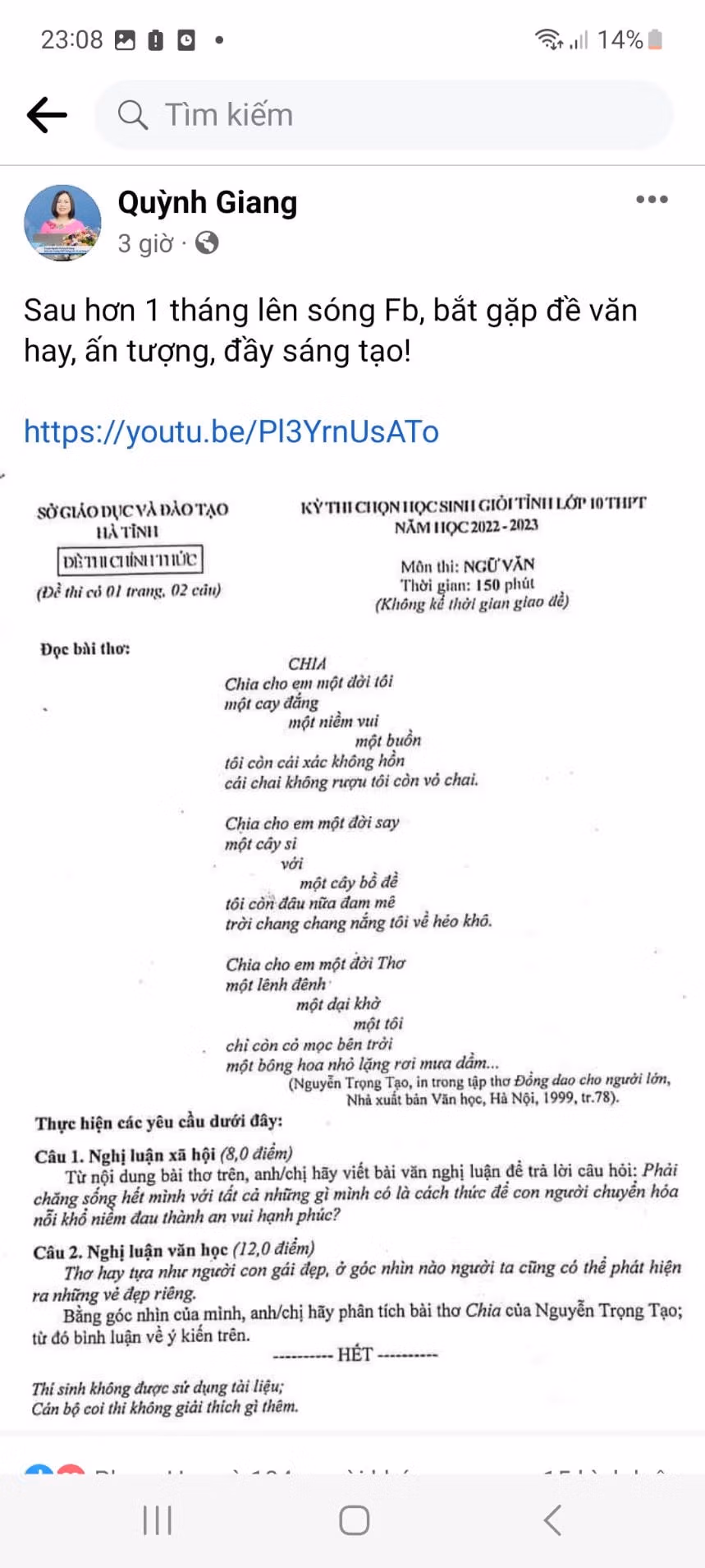 Còn với chương trình mới, đề thi mới này, học sinh thoải mái sáng tạo trên những ngữ liệu mới mẻ. Về bài thơ Chia, nếu chỉ đọc ngữ liệu, một số người sẽ cho là hơi “nặng đô”, hơi “già”, đòi hỏi người làm bài phải trải nghiệm, va vấp trong cuộc sống.