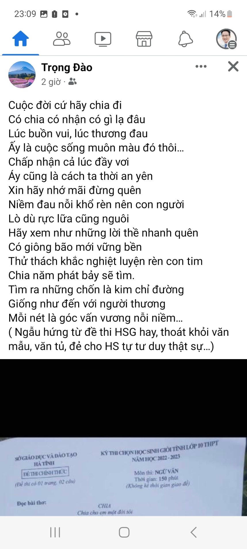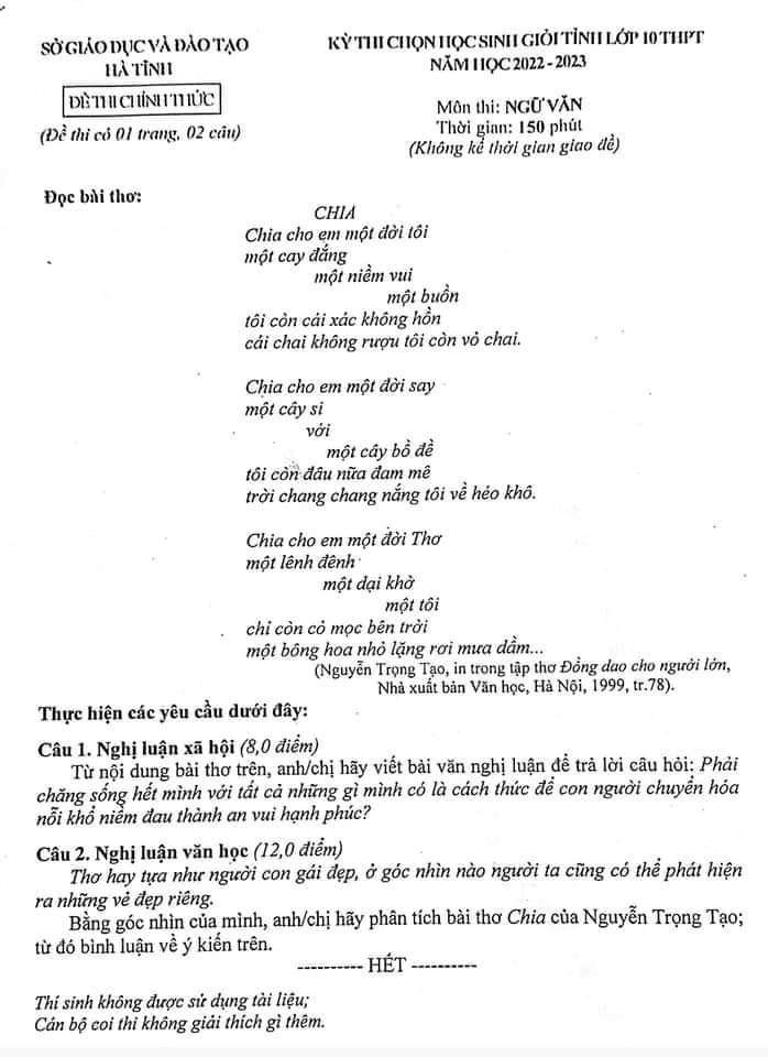 Sau khi kết thúc kỳ thi học sinh giỏi (HSG) tỉnh lớp 10 năm học 2022-2023 của tỉnh Hà Tĩnh, nhiều ý kiến bình luận xung quanh đề thi môn Ngữ Văn. Bởi đề thi không có trong sách giáo khoa và đã “xé rào”, vượt qua mọi khuôn mẫu trước đây.