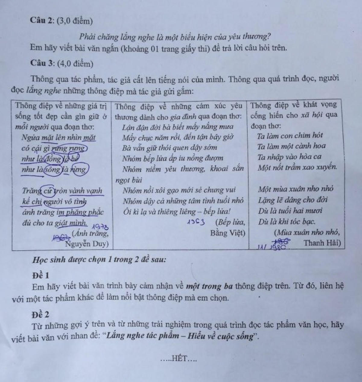 Cấu trúc đề có sự khác biệt so với năm ngoái, rõ nét nhất ở câu nghị luận xã hội, không còn là những hình ảnh minh họa như mọi năm mà câu nghị luận xã hội xuất hiện dưới dạng một câu hỏi hướng vào chủ đề của đề thi, đó là lắng nghe. Nhưng chỉ đi về một khía cạnh, lắng nghe là biểu hiện của yêu thương.