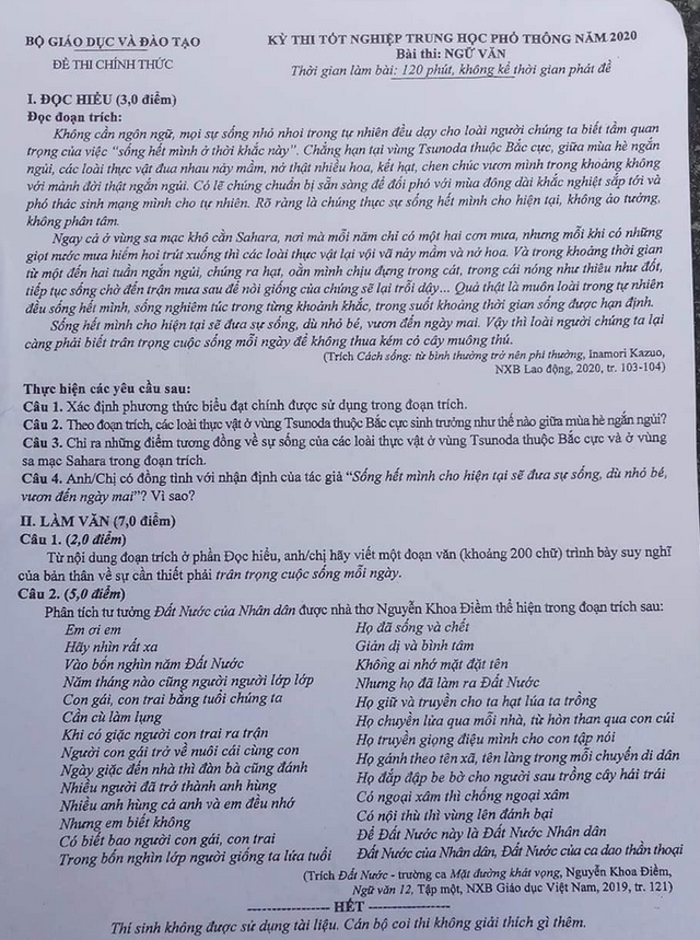 Đề thi Văn tốt nghiệp THPT 2020: Đất nước và trân trọng cuộc sống mỗi ngày