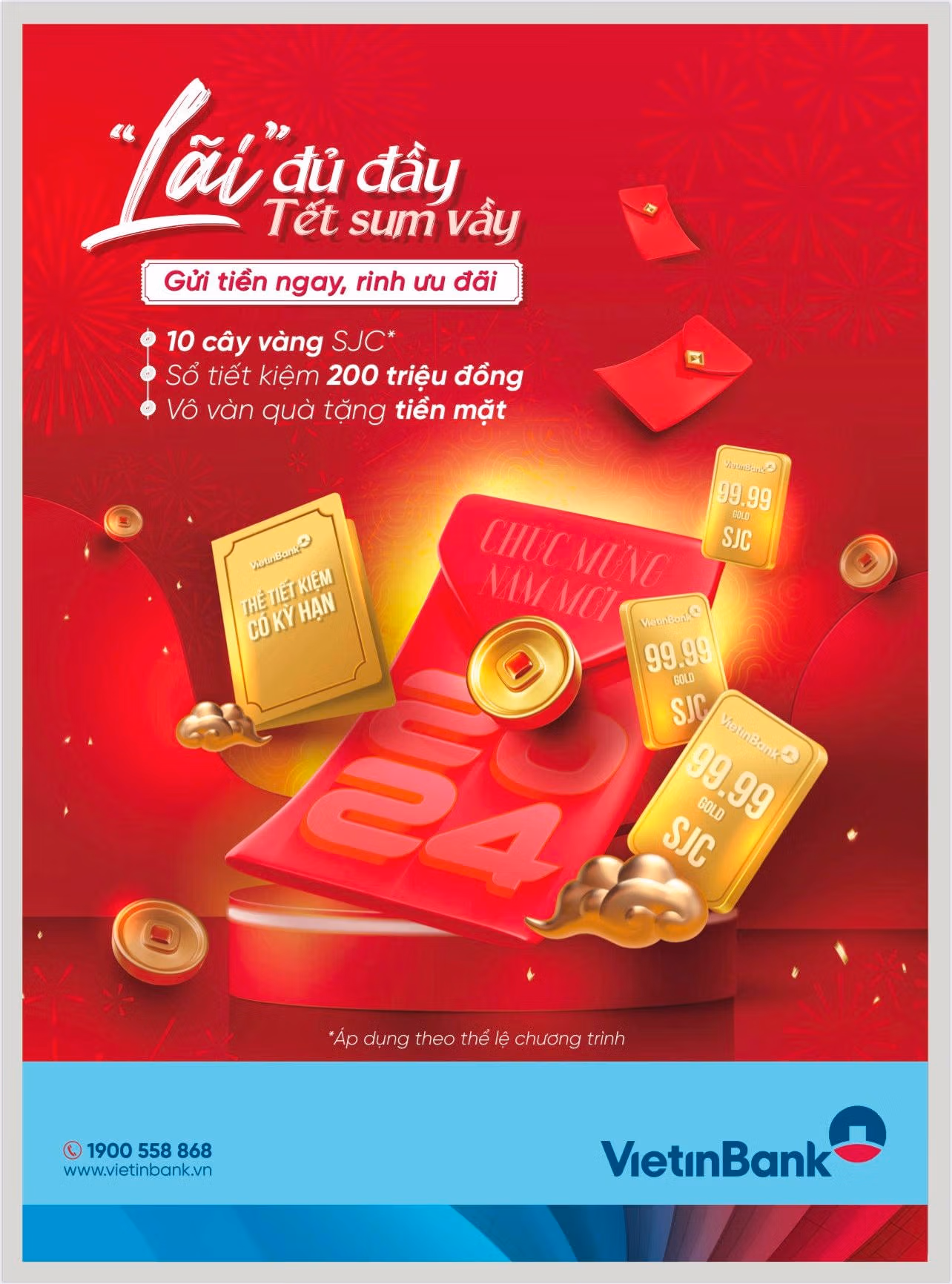 Với sứ mệnh mang đến những giải pháp tài chính tiện lợi và tin cậy, VietinBank triển khai chương trình khuyến mãi “Lãi” đủ đầy - Tết sum vầy với tổng giá trị quà tặng hơn 8 tỷ đồng. Chương trình diễn ra từ 1/12/2023 đến hết 31/3/2024 dành riêng cho các khách hàng cá nhân gửi tiền tại quầy giao dịch, gửi tiết kiệm online qua VietinBank iPay (web/mobile) hoặc ATM, đồng thời sở hữu gói tài khoản thanh toán của VietinBank (các gói Smart, Premium, Basic, Plus,….).