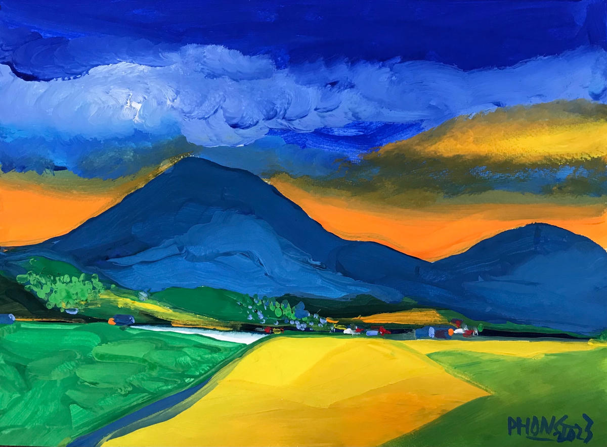 Nhà tôi bây giờ, chỉ cần đi lên sân thượng là có thể nhìn thấy ngọn núi Ba Vì xanh thẫm phía xa xa. Lúc hoàng hôn, mây chiều lờ lững giăng ngang đỉnh núi với nhiều hình thù kỳ ảo. Phía ấy, mặt trời sẽ hắt lên không trung những tia nắng cuối ngày thật lộng lẫy. Thường thì mùa hè, những đám mây sẽ có màu trắng xen hồng, cam, đỏ hay vàng óng ả. Khi màn đêm buông, chúng dần dần sẫm lại và trộn lẫn vào màu trời đêm.