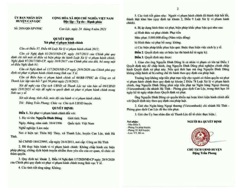 Ngày 25/8, thông tin từ UBND huyện Can Lộc (tỉnh Hà Tĩnh) cho biết, Chủ tịch UBND huyện Đặng Trần Phong vừa ra quyết định xử phạt hành chính đối với 3 người dân về việc không chấp hành các biện pháp phòng, chống dịch bệnh truyền nhiễm theo yêu cầu của cơ quan, tổ chức có thẩm quyền.