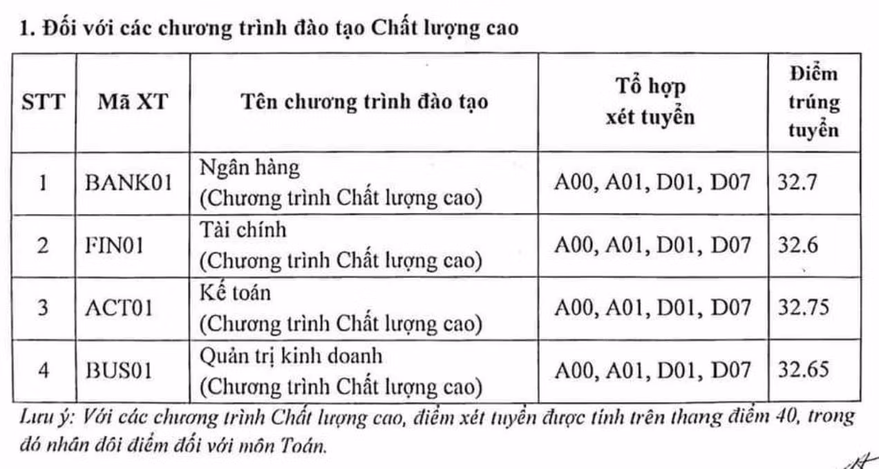 Điểm chuẩn các chương trình đào tạo Chất lượng cao như sau: