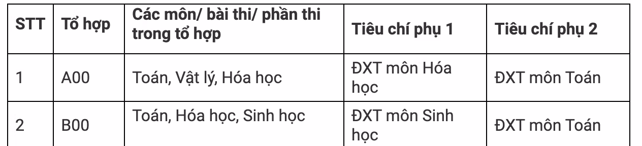 Trong trường hợp số thí sinh đạt ngưỡng điểm trúng tuyển vượt quá chỉ tiêu, các thí sinh bằng điểm xét tuyển ở cuối danh sách sẽ được xét trúng tuyển lần lượt theo tiêu chí phụ 1, tiêu chí phụ 2, thứ tự nguyện vọng của thí sinh trong phiếu đăng ký xét tuyển. Tiêu chí phụ 1, tiêu chí phụ 2 cụ thể như sau: