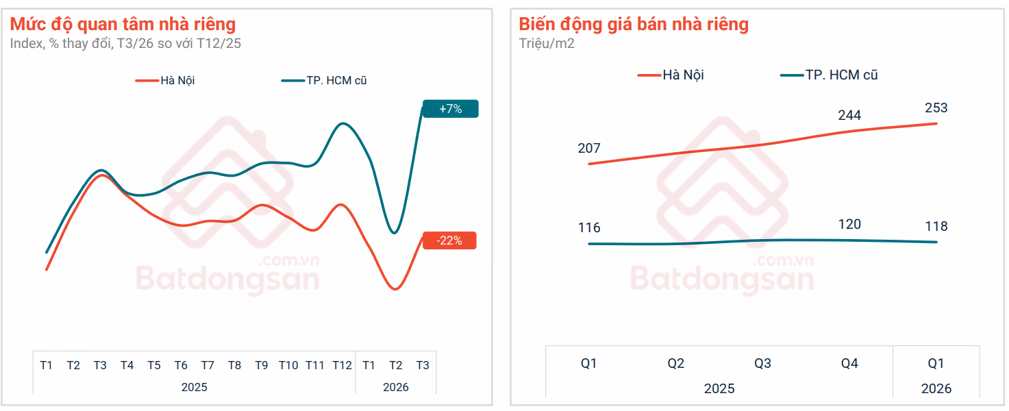 Theo dữ liệu của nền tảng công nghệ Batdongsan.com.vn, loại hình nhà riêng trong quý I/2026 thể hiện rõ sự phân hóa giữa Hà Nội và TP.HCM. Cụ thể, TP.HCM cũ ghi nhận mức độ quan tâm tăng khoảng 7% so với cuối năm 2025, trong khi Hà Nội vẫn thấp hơn khoảng 22% so với cùng kỳ.