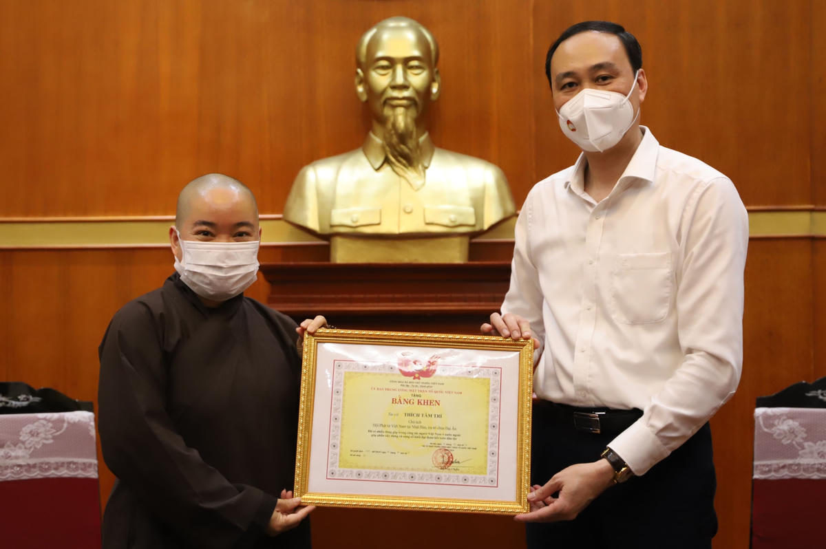 Nhân dịp này, Phó Chủ tịch Phùng Khánh Tài đã trao Bằng khen của UBTƯ MTTQ Việt Nam cho Sư cô Thích Tâm Trí với những đóng góp trong công tác người Việt Nam ở nước ngoài góp phần xây dựng và củng cố khối Đại đoàn kết toàn dân tộc.