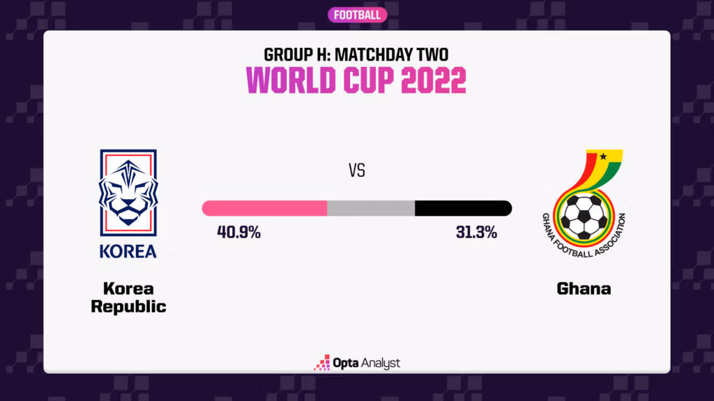 Với 40,9% cơ hội chiến thắng, Hàn Quốc vẫn được siêu máy tính của Opta đánh giá cao hơn đối thủ. Tuy vậy, khả năng giành chiến thắng của Ghana cũng không quá thấp: 31,3%. Một trận thua hoặc thậm chí tỷ số hòa (27,8%) là kết quả mà người hâm mộ xứ kim chi không mong muốn.