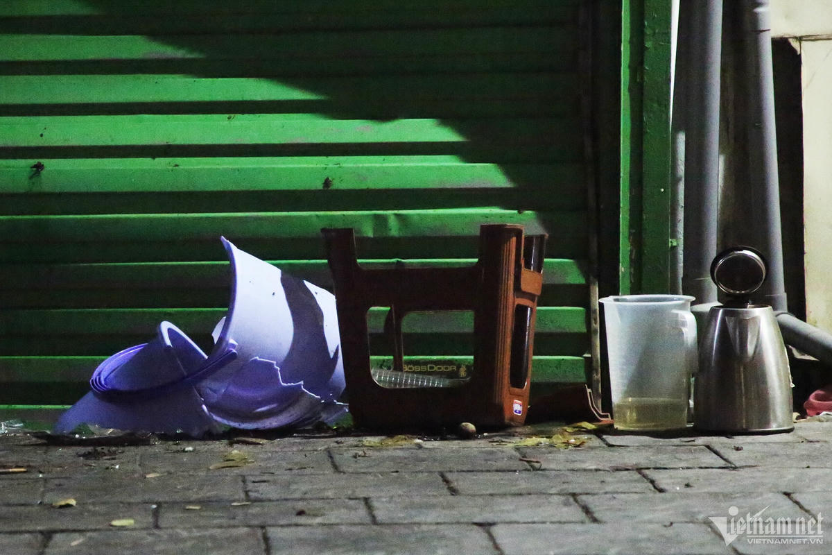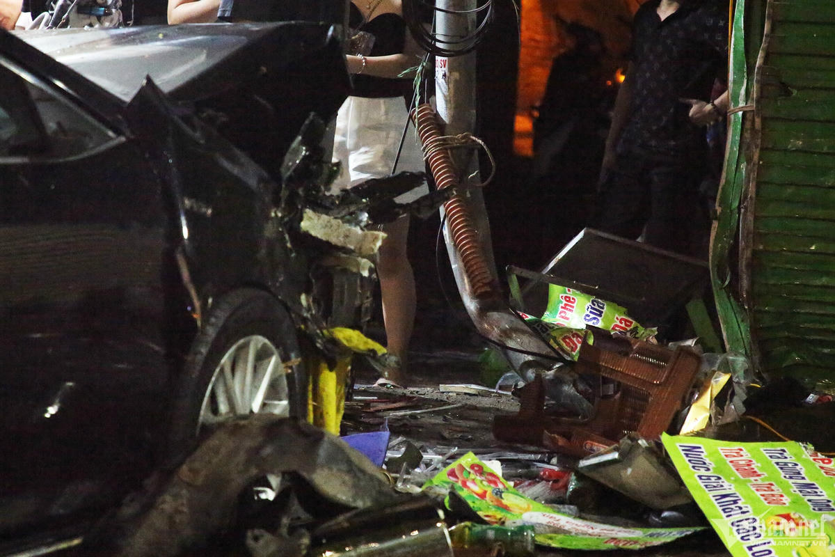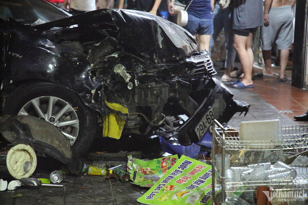 Cú va chạm mạnh khiến đầu ô tô bị móp méo, nắp ca pô biến dạng. Các vật dụng của quán trà đá như ghế, cốc... vỡ vụn, văng khắp vỉa hè.