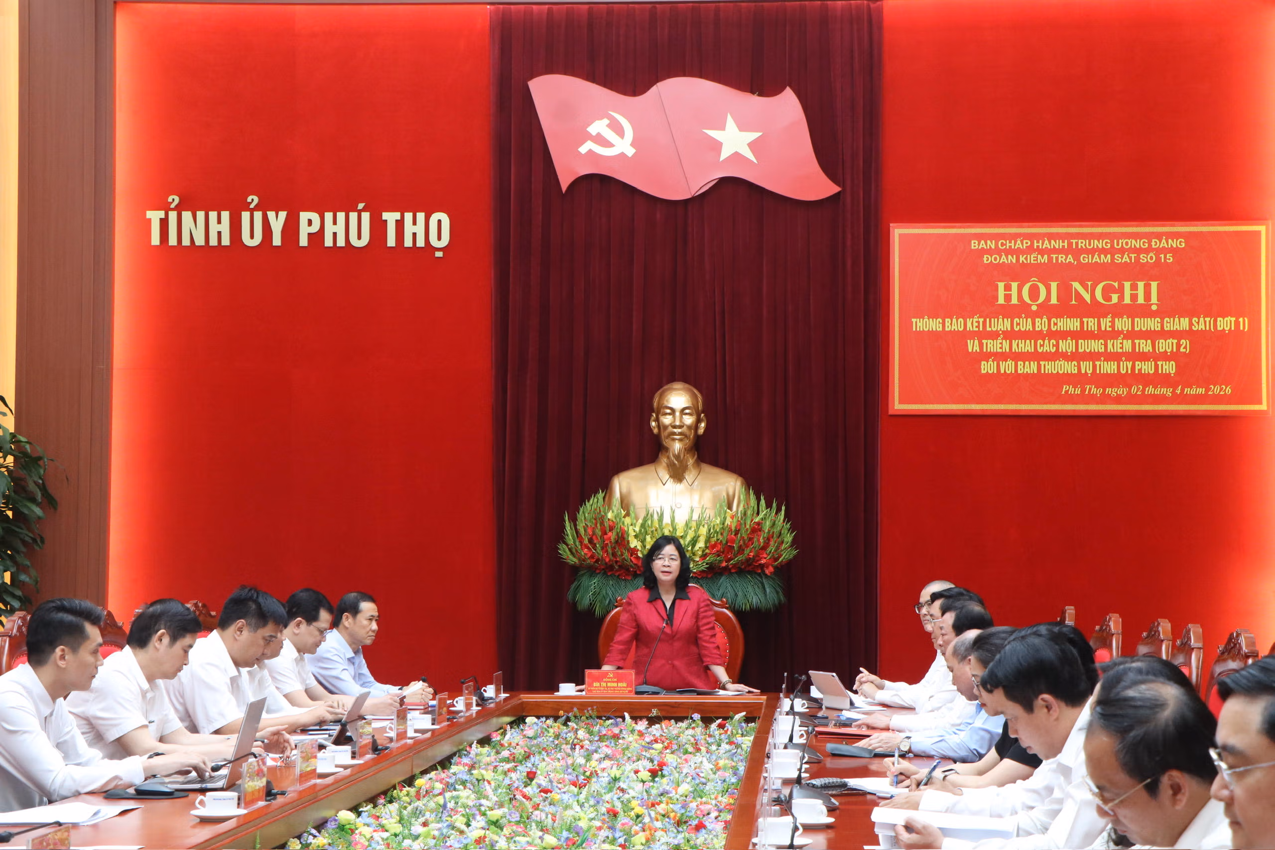 Chiều 2/4, Đoàn kiểm tra, giám sát số 15 của Bộ Chính trị, Ban Bí thư làm việc với Ban Thường vụ Tỉnh ủy Phú Thọ để thông báo Kết luận của Bộ Chính trị về nội dung giám sát (đợt 1) và triển khai các nội dung kiểm tra (đợt 2). Bà Bùi Thị Minh Hoài - Ủy viên Bộ Chính trị, Bí thư Trung ương Đảng, Chủ tịch UBTƯ MTTQ Việt Nam, Trưởng Đoàn kiểm tra, giám sát dự và chủ trì buổi làm việc.