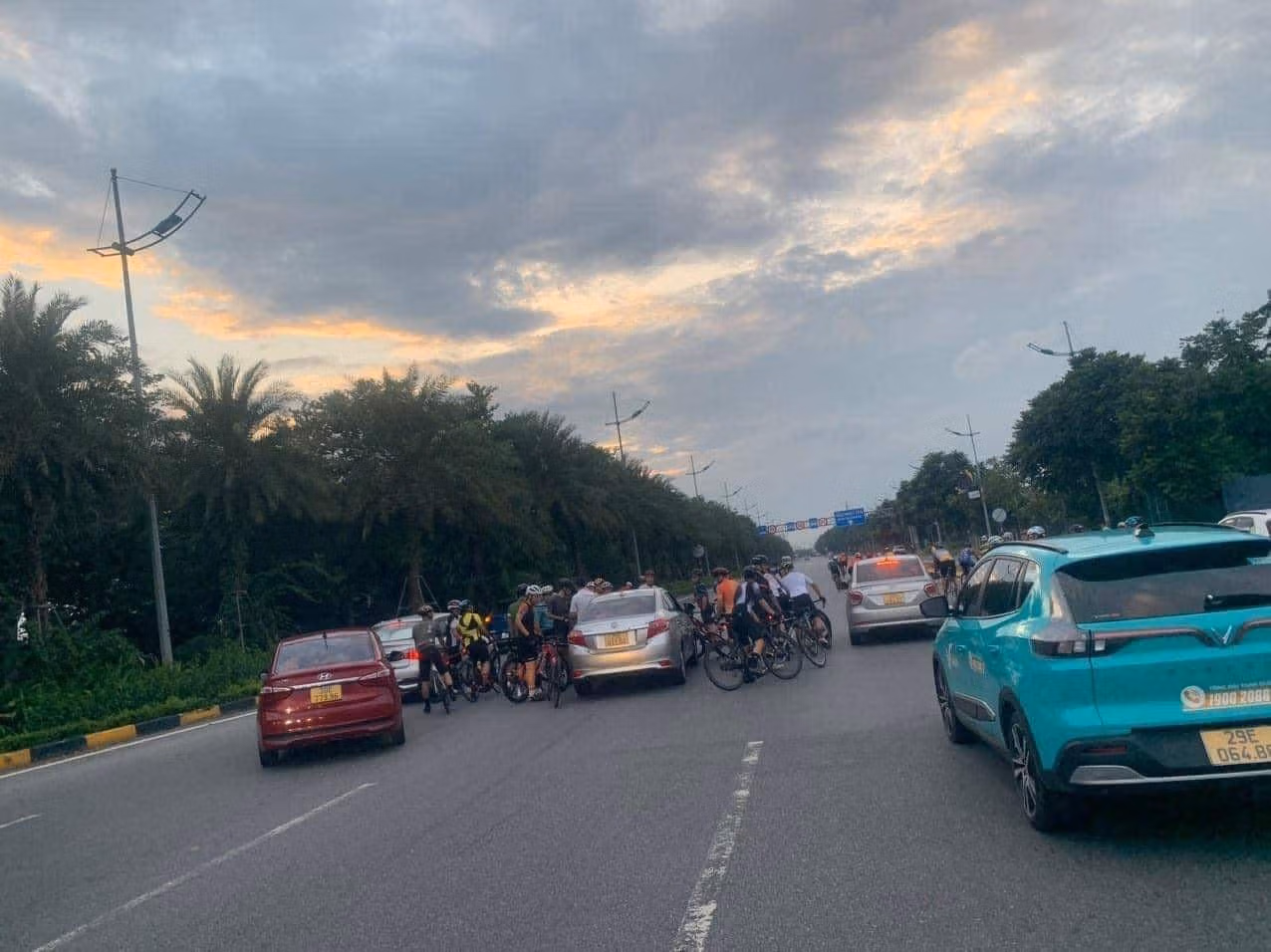 Theo đó, đoạn video clip thể hiện thời điểm xảy ra vụ việc vào sáng sớm trên đường Võ Nguyên Giáp hướng sân bay Nội Bài (đang trích xuất camera xác định thời điểm). Một lái xe ô tô đi đúng làn dành cho phương tiện ô tô đã phải đi chậm xử lý tình huống khoảng gần 20 chiếc xe đạp thể thao vi phạm giao thông chạy phía trước.