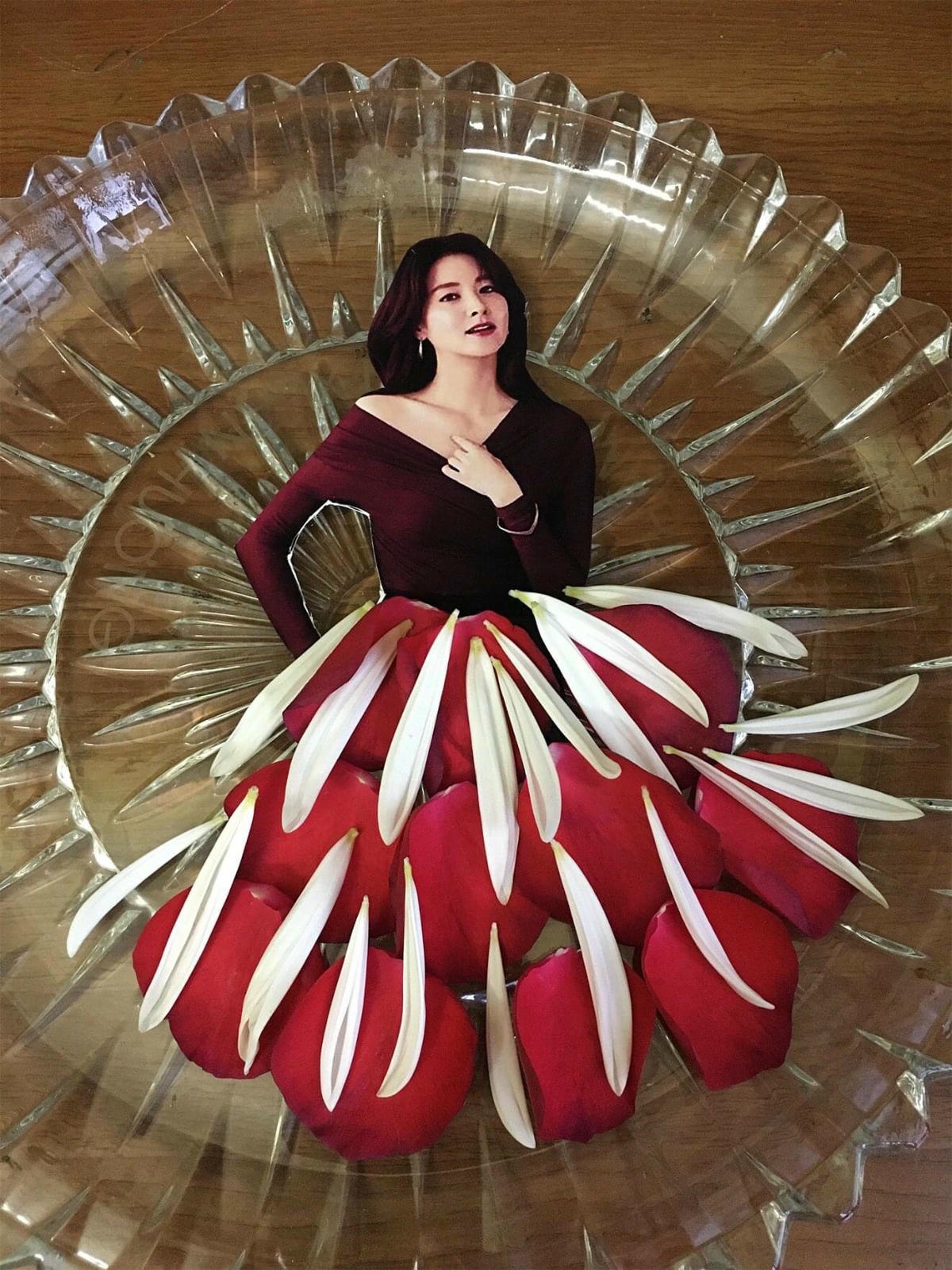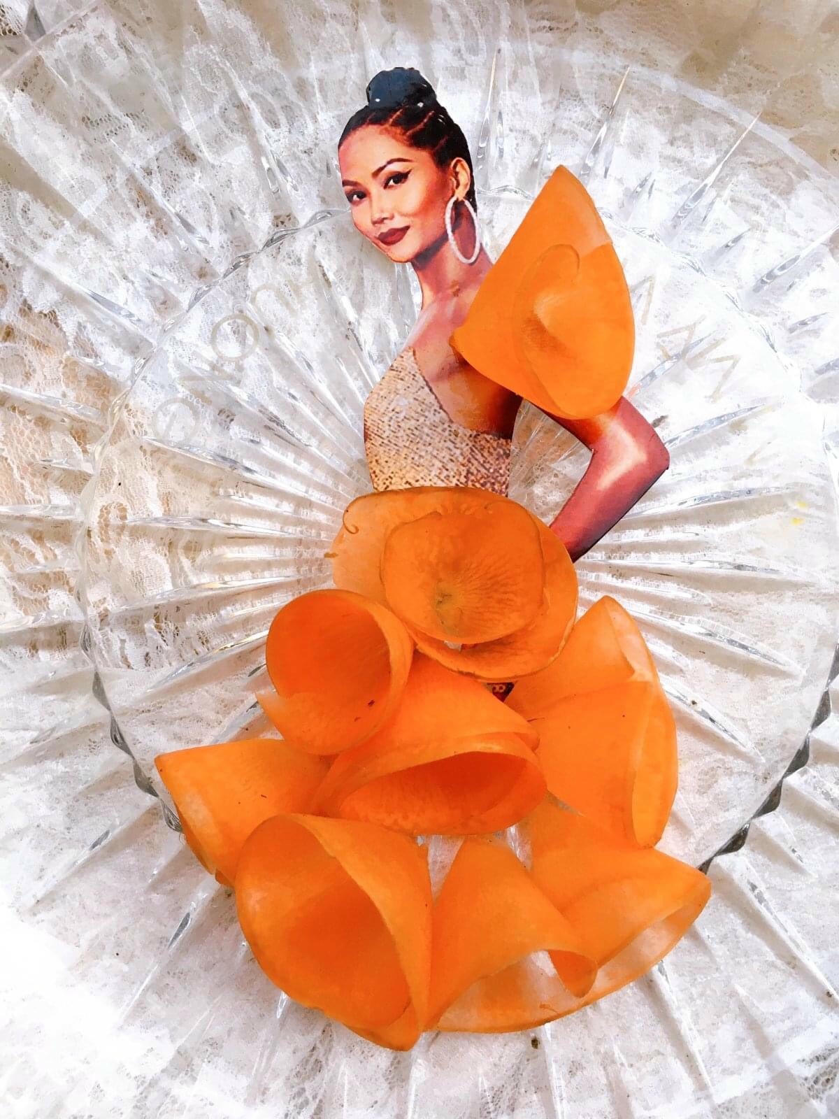 Dịch Covid-19 ảnh hưởng khiến công việc của chị Giang bị ngưng trệ. Suốt hơn bốn tháng giãn cách xã hội làm việc tại nhà, chị liền nảy ra ý tưởng thiết kế những chiếc váy cho những ngôi “Sao” mà bản thân yêu thích từ hoa, lá, rau, củ, quả.