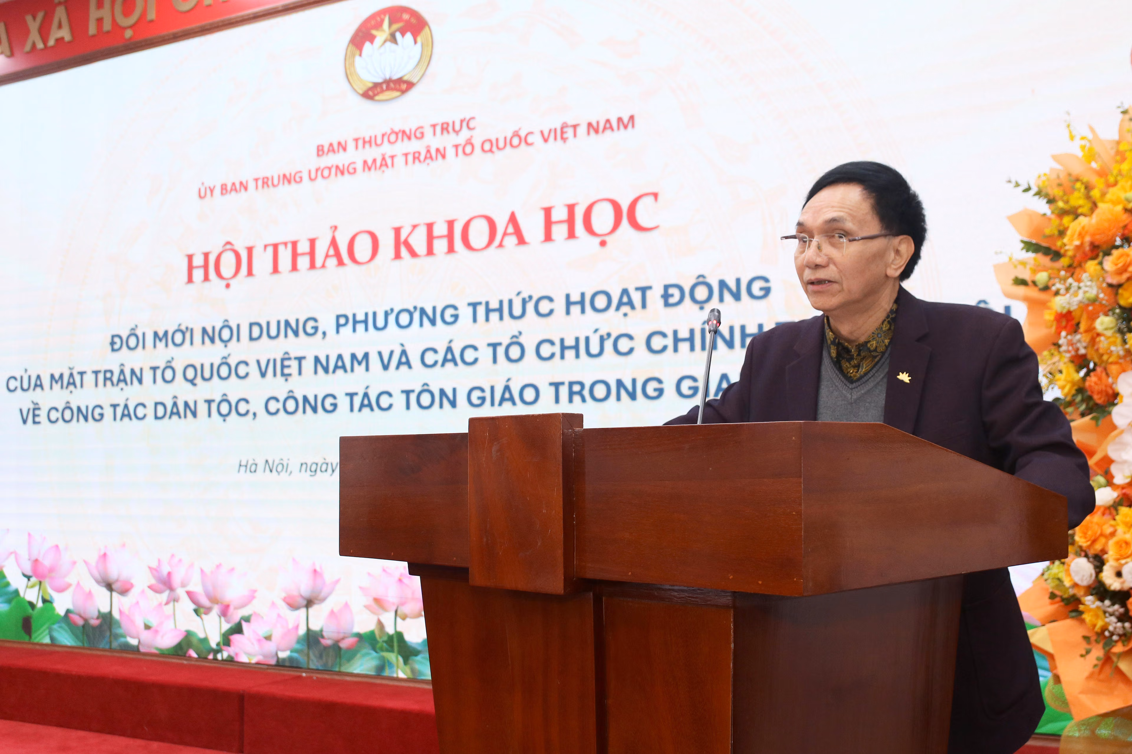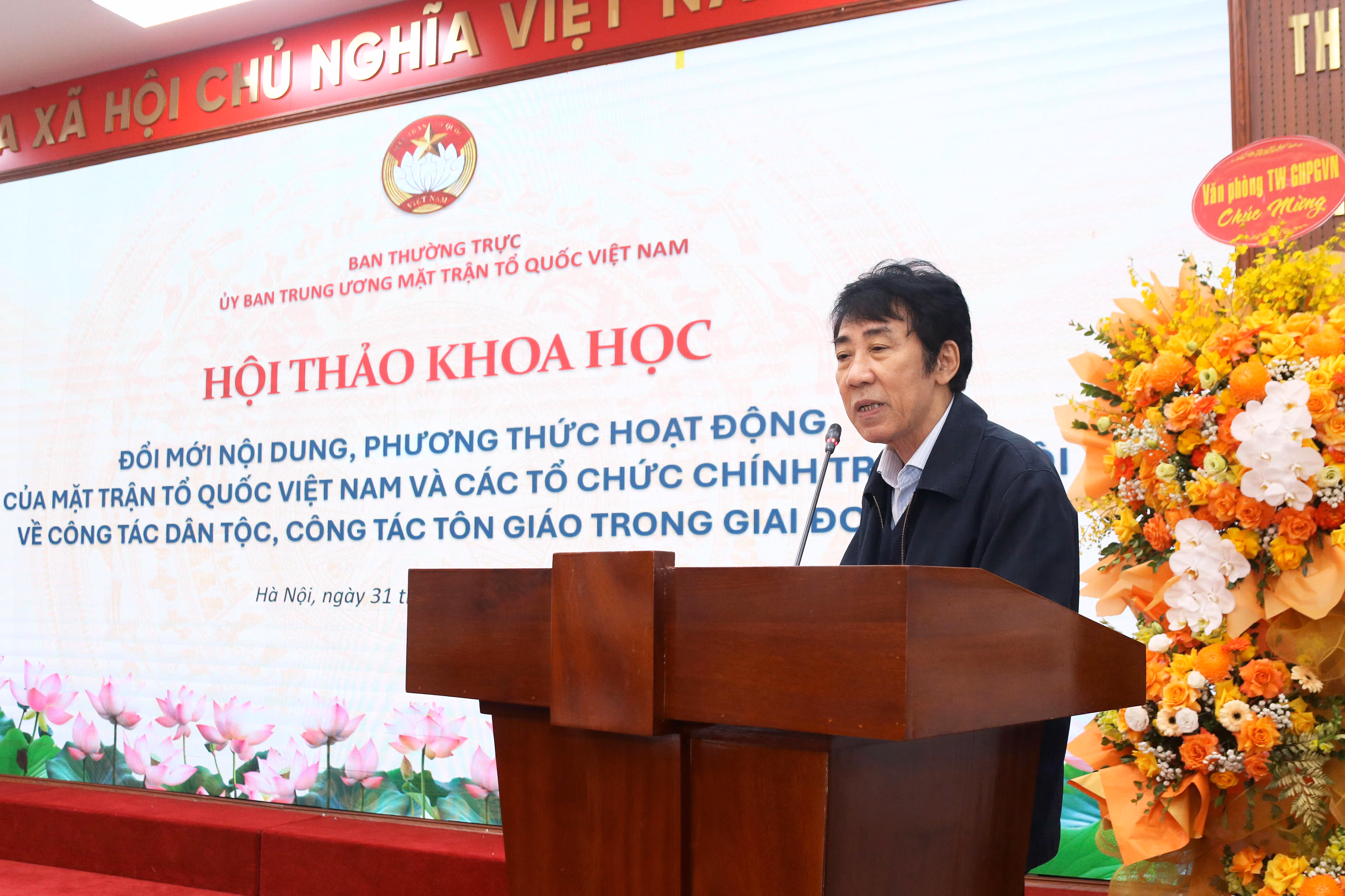 Tham luận tại Hội thảo, TS Ngô Sách Thực, Ủy viên Đoàn Chủ tịch, nguyên Phó Chủ tịch UBTƯ MTTQ Việt Nam cho biết, nội dung, phương thức thực hiện của Mặt trận trong công tác dân tộc, tôn giáo có vị trí rất quan trọng trọng thực hiện vai trò nòng cốt của MTTQ trong xây dựng khối đại đoàn kết toàn dân tộc. Chính vì vậy, Đoàn Chủ tịch UBTƯ MTTQ Việt Nam Kết luận số 01 và Kết luận số 02 chuyên đề thực hiện công tác này, sau thực hiện sơ kết và kết luận tiếp tục đổi mới thực hiện.